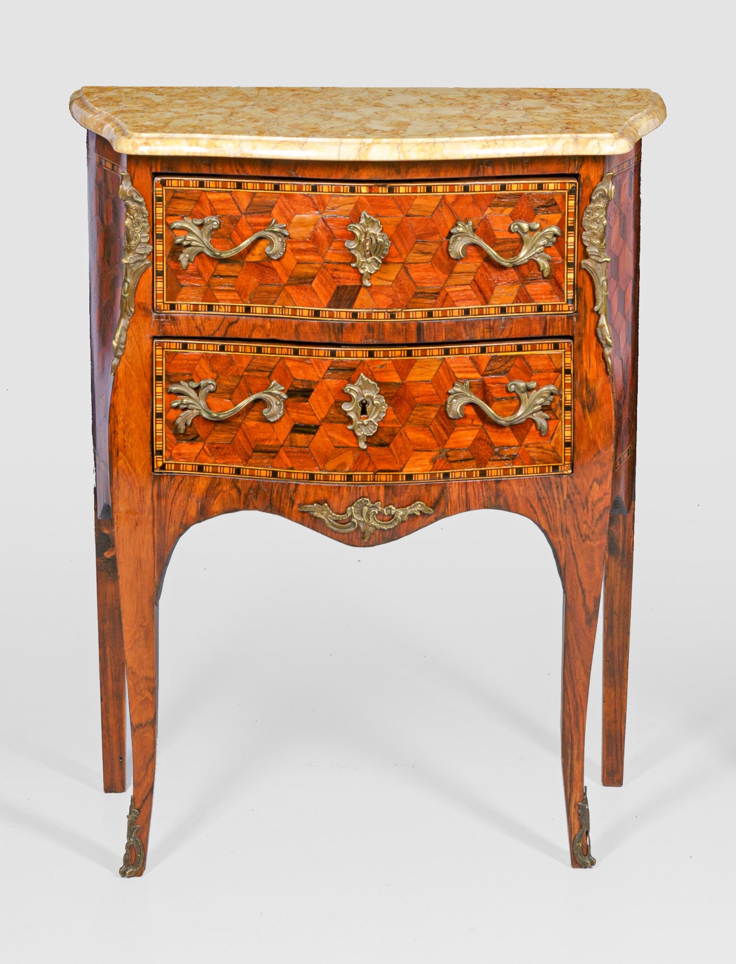 Palisander, furniert. Dreiseitig bombierter Korpus, flankiert von schmalen, ausgezogenen Ecklisenen auf hohen, leicht geschweiften Beinen. In der gegliederten Front zwei Schubfächer. Flächendeckende Furnierfelder aus Würfelmarketerie. Korrespondierende Deckplatte aus cremefarbenem Marmor. H. 79 cm. 63 cm x 34 cm.