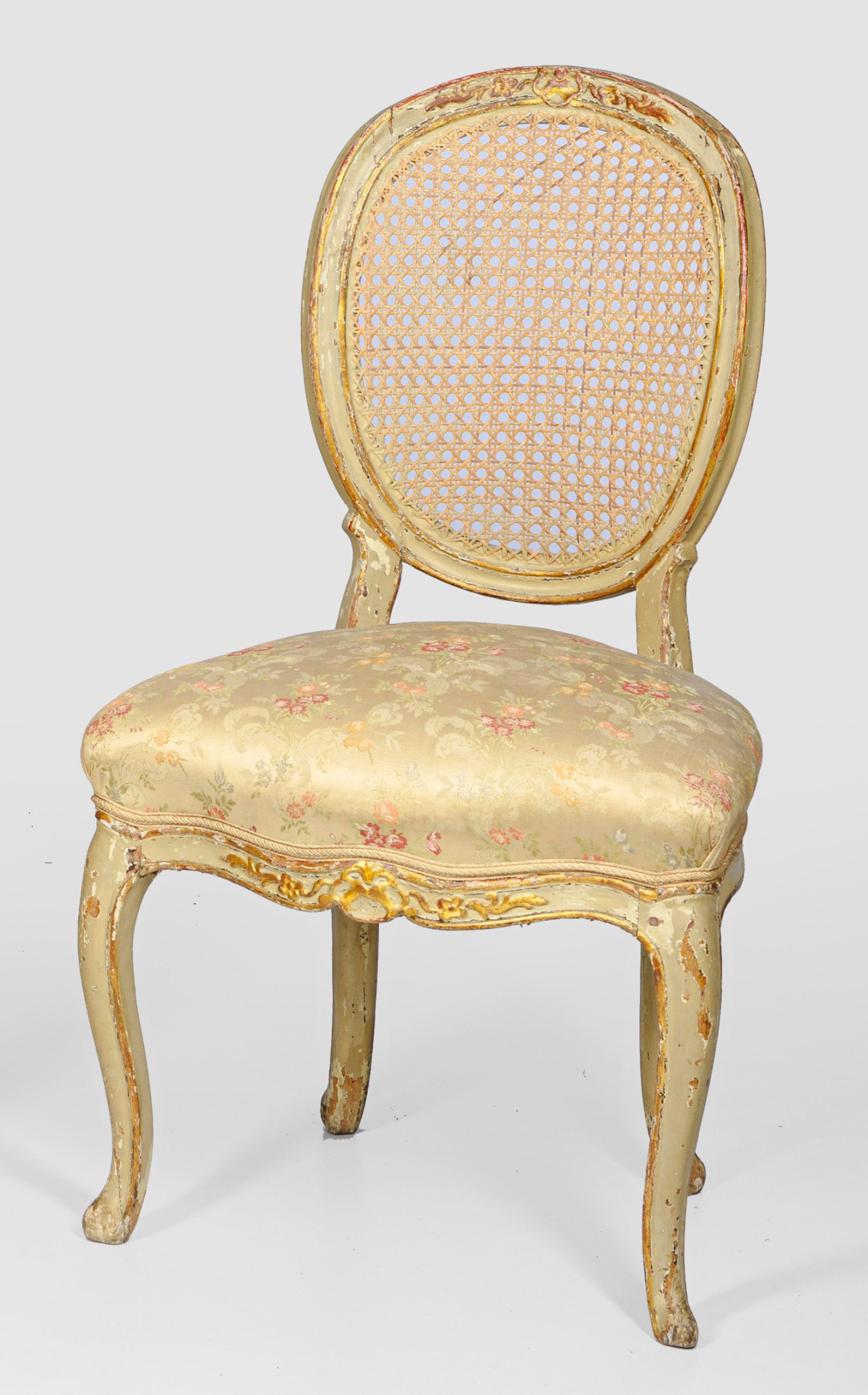 Holz, grau gefasst. Passig geschweifte Zarge auf geschwungenen Beinen. Ovale, gewölbte Rückenlehnenrahmung aus Rohrgeflecht. Sitzfläche gepolstert und bezogen. Sitz-H. 49 cm.