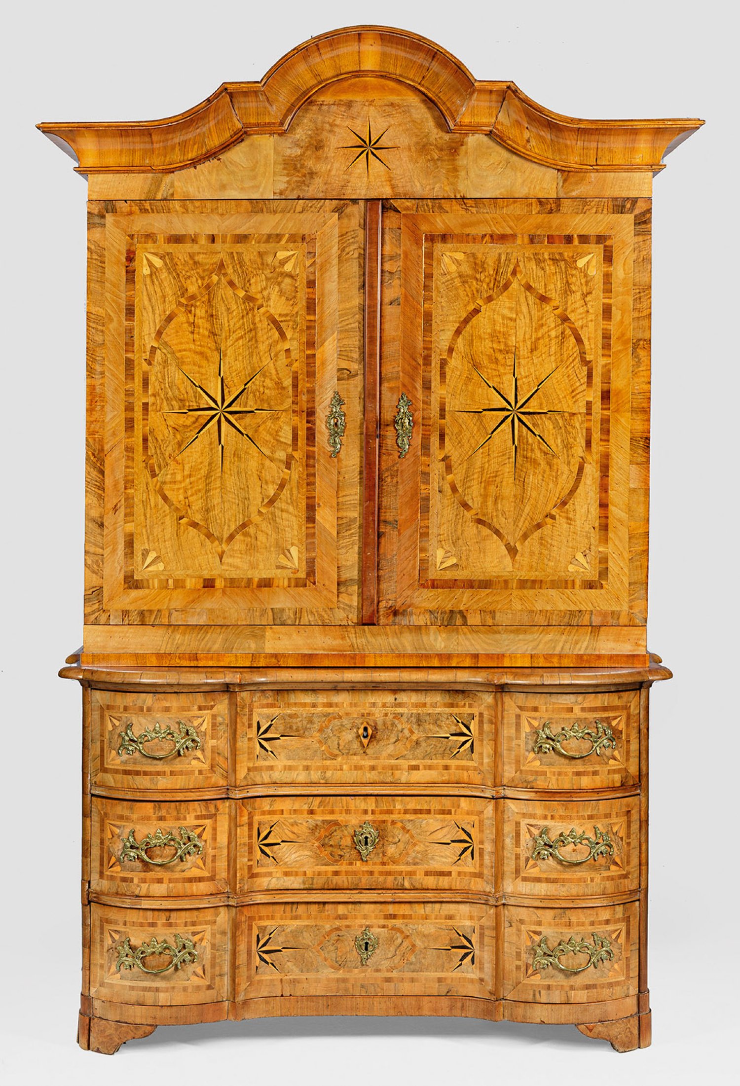Nussbaum, furniert sowie Einlagen aus Pflaumenholz. Gerader, querrechteckig angelegter Korpus mit seitlichen Griffen auf schmaler Zarge und gesägten Füßen. In der gegliedertren Front drei breite, gegenläufig geschweifte Schubladen. Profilierte Deckplatte. Oberhalb zweitüriger Aufsatz mit gekehltem, geschweift ansteigendem Gesims. Flächendeckend breit gerahmte Furnierfelder, von Bandeinlagen begrenzt sowie intarsierte Faltsterne. Erg.; H. 222 cm., 145 cm x 64 cm.