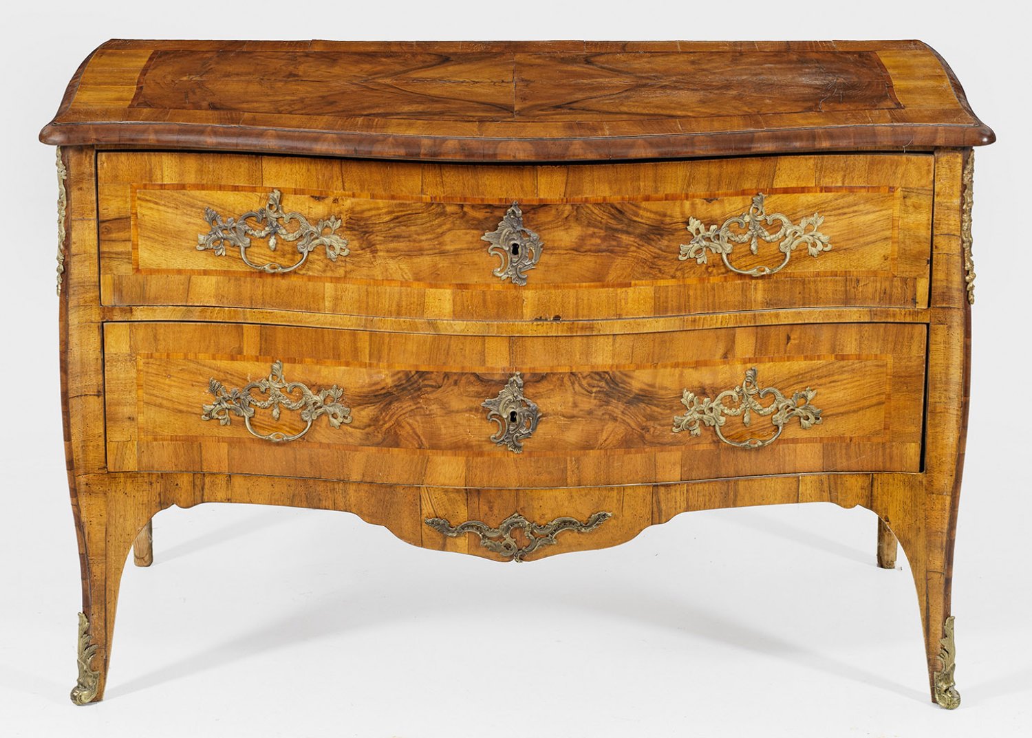 Nussbaum, furniert sowie Einlagen aus Pflaumenholz. Gerader, querrechteckig angelegter Korpus mit ausgebogter Zarge, flankiert von schlanken, leicht ausgezogenen Ecklisenen, in hohe Beine übergehend. In der gegliederten Front zwei breite, leicht geschweifte Schubladen. Gering überstehende, profilierte Deckplatte. Flächendeckend breit gerahmte Furnierfelder. H. 81 cm. 124 cm x 64 cm.