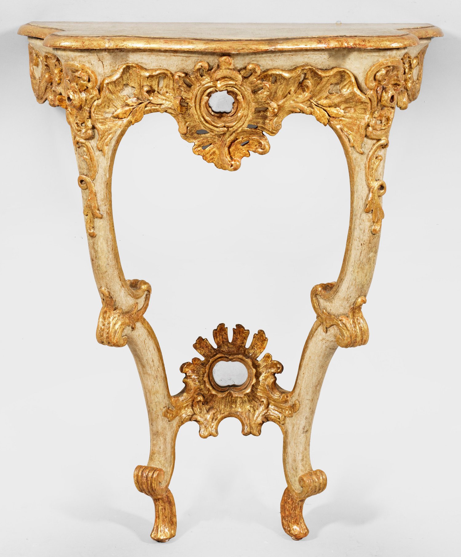 Holz, geschnitzt, elfenbeinfarben gefasst und teilw. vergoldet. Passig geschweifte, teilw. durchbrochen gearbeitete Zarge aus reliefplastisch gearbeiteten Rocaillen mit Spiegeleinsätzen, in geschwungene Beine aus gegeneinander gestellten Voluten übergehend. Unterhalb durch große Blattkartusche verbunden. Gering überstehende, profilierte Deckplatte. H. 83 cm. 68 cm x 37 cm.
