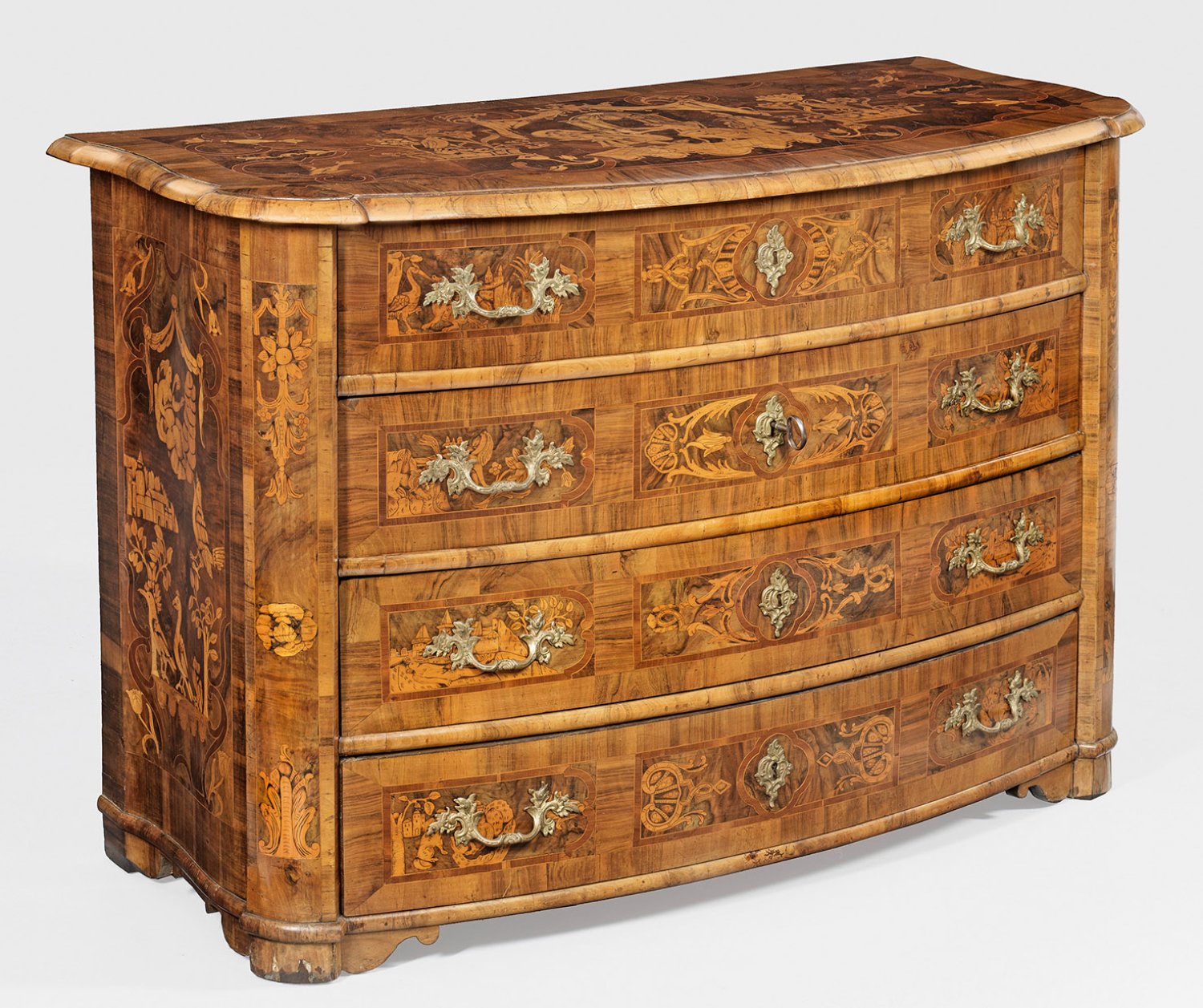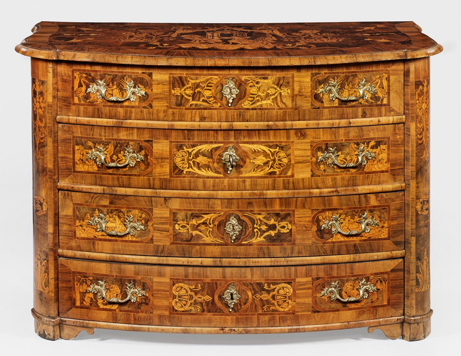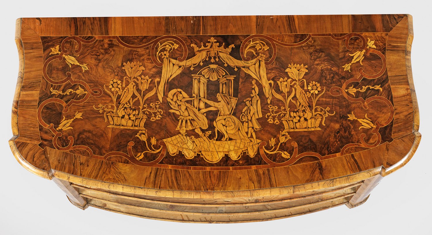Nussbaum, furniert sowie reiche Einlagen aus brandschattiertem Ahorn. Gerader, querrechteckig angelegter und seitlich geschweifter Korpus, flankiert von gerundeten Ecklisenen, in entsprechende Füße übergehend. In der gegliederten Front drei breite, bombierte Schubladen. Korrespondierende, an den Ecken leicht verkröpfte Deckplatte. Flächendeckend breit gerahmte, von Bandeinlagen begrenzte Furnierfelder mit reichem Intarsiendekor aus unterschiedlichen Landschaften, Blattvoluten, Kelchblüten und Vögeln sowie Figurenszenerien und teilw. bekrönten Baldachinen. H. 95,5 cm. 117 cm x 63 cm.