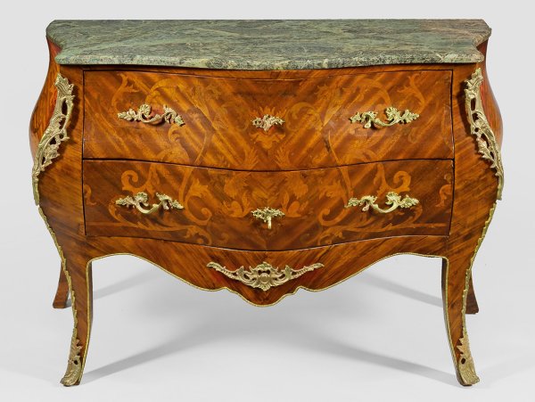 Mahagoni, furniert. Dreiseitig bombierter Korpus, flankiert von weit ausgezogenen Ecklisenen, in ausgestellte Beine übergehend. In der gegliederten Front zwei große Schubladen sans traverse. Flächendeckend gespiegelt angeordnete Furnierfelder mit üppig eingelegtem Rankenwerk. Gering überstehende Deckplatte aus grün gemasertem Marmor. H. 84 cm. 120 cm x 60 cm.