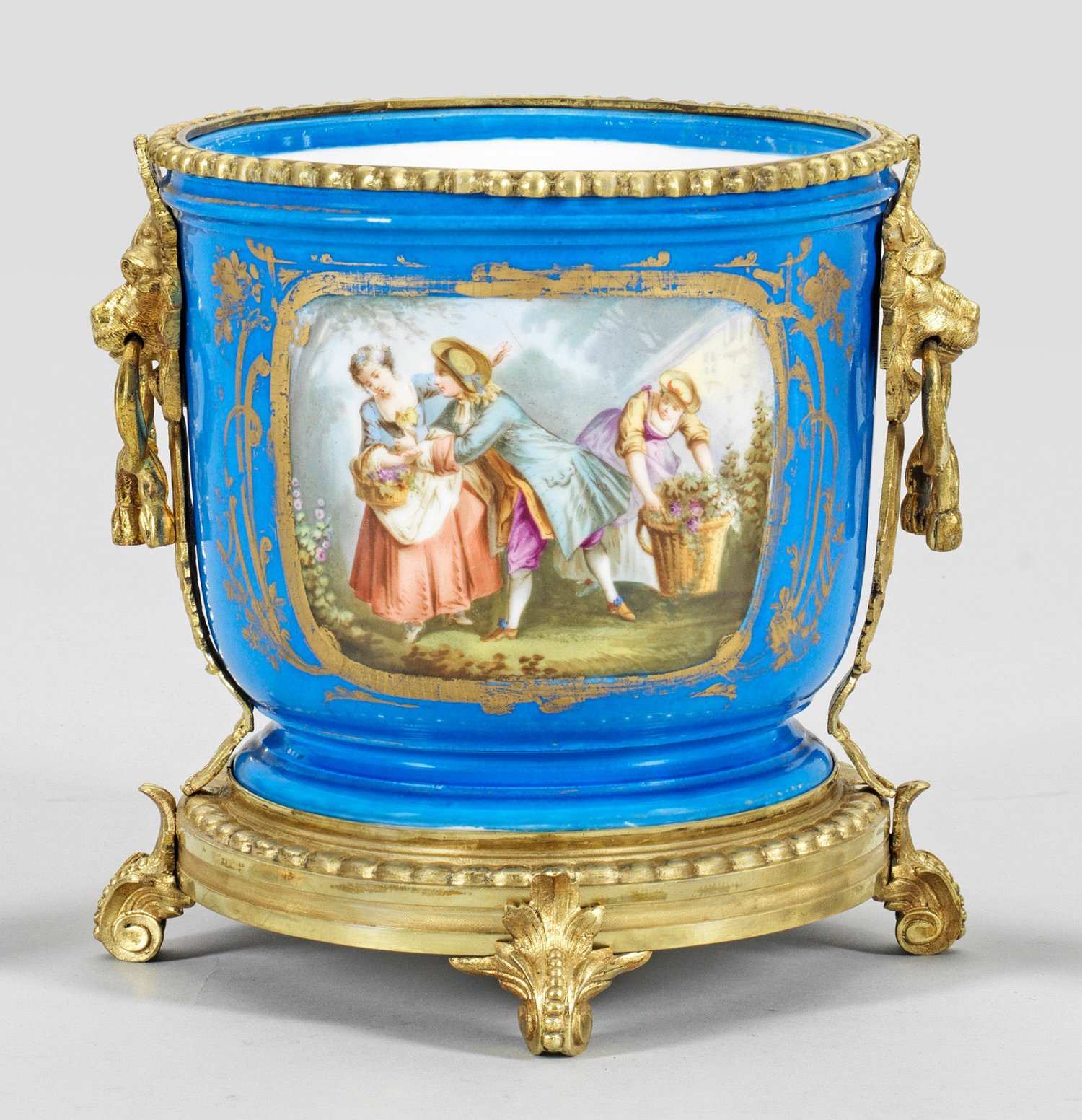 Porzellan und vergoldete, reliefplastisch gearbeitete Bronzemontierung aus volutenförmig gefußtem Sockel, Löwenmaskarongriffen sowie Mündungsring. Runder, zylindrischer Porzellankorpus über profiliertem Stand. Beidseitig der Wandung, in blauem Fond ausgesparte, goldkonturierte Reserven mit galanter figürlicher Szene bzw. Blumenarrangement in polychromer Malerei. H. 26,5 cm D. 23,5 cm.