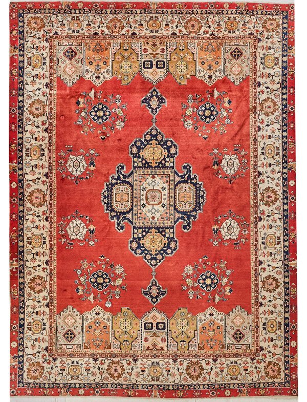 Persien. Mitte 20. Jh.; Wolle auf Baumwolle. Im monochromen roten Innenfeld großes, kartuschenförmiges Zentralmedaillon mit Anhängern sowie Musterung aus blütenumgebenen Rosetten und Palmetten. An den Kurzseiten jeweils breiter Zungenfries sowie umlaufend elfenbeinfarbene Bordüre aus Palmettenranken. 286 cm x 405 cm.