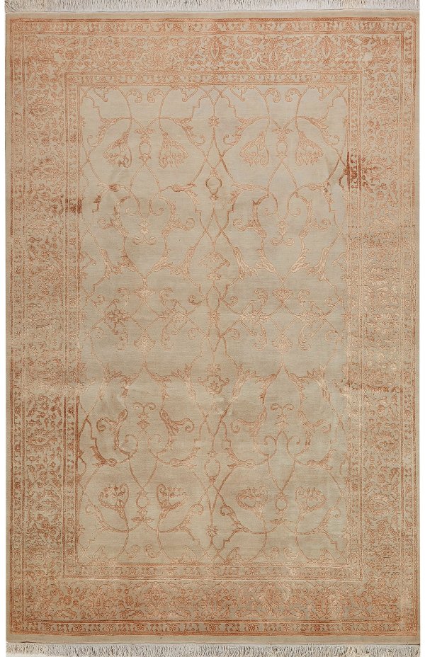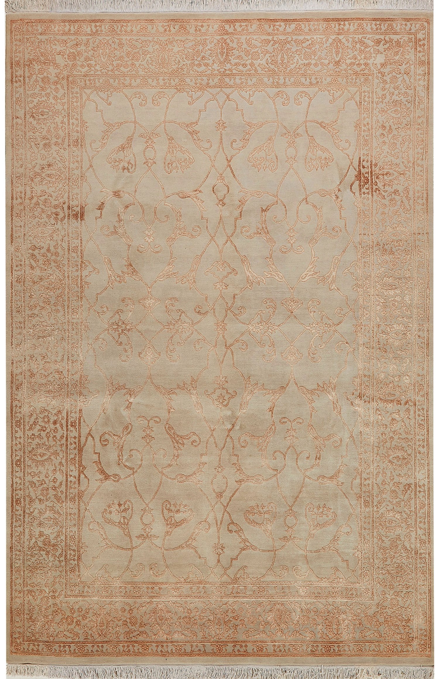 Wolle mit Seide auf Baumwolle. Flach reliefiert. Auf beigefarbenem Fond flächendeckende Musterung aus Arabesken und Blattwerk. Umlaufend breite Bordüre aus dichten Palmettenranken, flankiert von schmalen Bändern in entsprechender Farbigkeit. 198 cm x 295 cm.