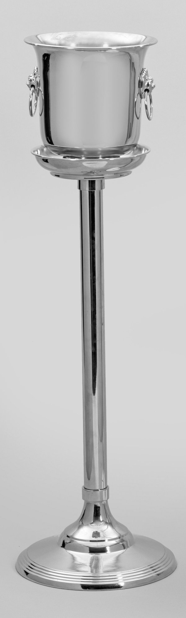 2-tlg.; Metall, vernickelt. Gestell aus profilierter Basis und Rundschaft als Träger für schalenförmige Abstellfläche. Sich konisch weitender Kühler mit erhaben reliefierten Löwenmaskarons und Greifringen. Ges.-H. 87 cm.