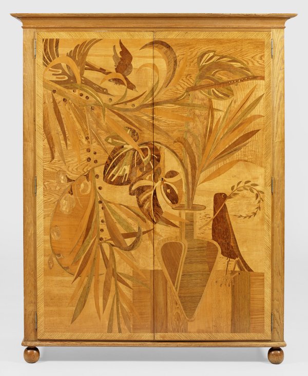 Eschenholz, furniert sowie flächendeckende Marketerie aus unterschiedlichen, teilw. grün gefärbten Edelhölzern wie Ulmenholz, Wurzelnuss und Ahorn. Gerader, hochrechteckiger Korpus auf Kugelfüßen mit umlaufendem Kehlgesims. In der gegliederten Front zwei große Türen mit flächendeckendem Intarsiendekor aus großem Vasenmotiv sowie üppigem Blattwerk und Vögeln. H. 192 cm. 155 cm x 61 cm.