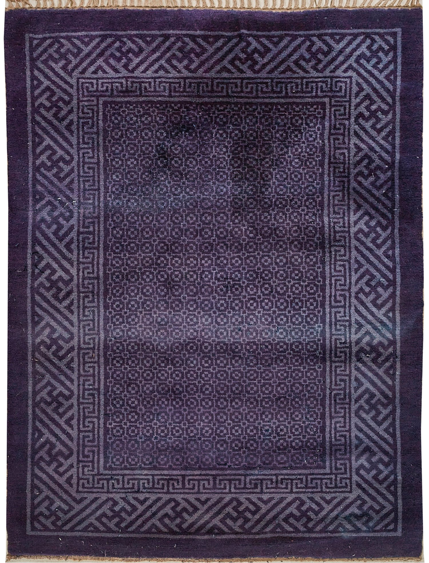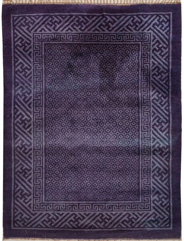 China. Wolle auf Baumwolle. Im Innenfeld flächendeckende Mosaikmusterung in zweifarbigem Blau, begrenzt von Mäanderband. Umlaufend breite Bordüre mit flächendeckendem Swastika-Muster. 133 cm x 172 cm.