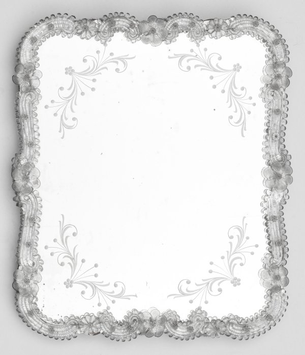 Farbloses Glas. Passig geschweifte Rahmung aus gegeneinander gestellten Volutenelementen und applizierten Blüten sowie partiell floral geätztes Spiegelglas. 53 cm x 45 cm.