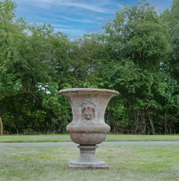 Terrakotta. Über quadratischer Plinthe balusterförmiger Korpus, seitlich mit reliefplastischen Maskarons im Groteskstil sowie weit ausschwingendem Lippenrand. Umlaufend der Wandung breiter Lorbeerfries sowie flache Kanneluren mit Blütendekor. Altersspuren. H. 149 cm.