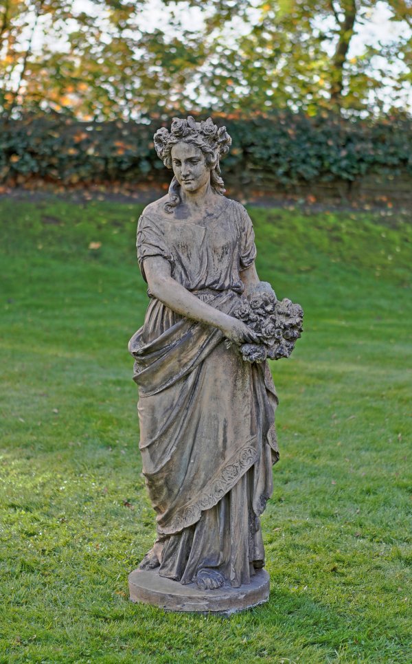 Sandfarbener Scherben. Vollplastische, neoklassizistische Statue der Flora. Auf einer runden Plinthe schreitend, in einem bodenlangen, antikisierenden Gewand, als Attribute mit beiden Händen an ihrer linken Hüfte ein Füllhorn mit Rosen haltend und auf ihrem Kopf ein Kranz aus Rosenblüten. Füllhorn besch., partiell best.; H. 162 cm.