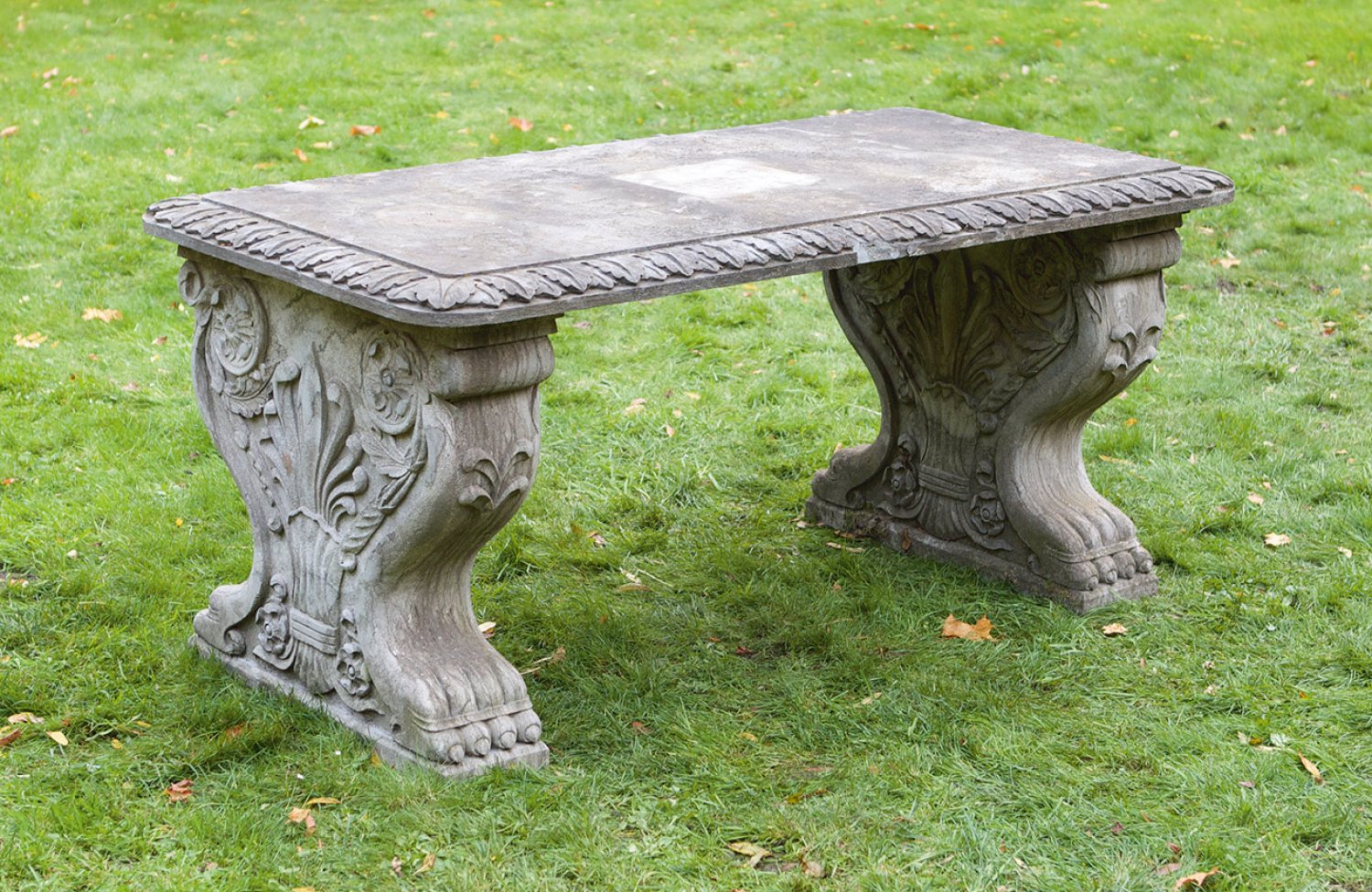 Grau-blau gemaserter, sog. Belgischer Sandstein. Balusterförmige Seitenwangen aus üppigen, erhaben reliefierten, eingerollten Blattvoluten und stilisierten Lilienmotiven, in Tatzenfüße übergehend. Rechteckige Deckplatte mit gerundeten Ecken sowie umlaufend breitem Fries aus Akanthusblatt. Unw. besch.; H. 81 cm. 174 cm x 90 cm.