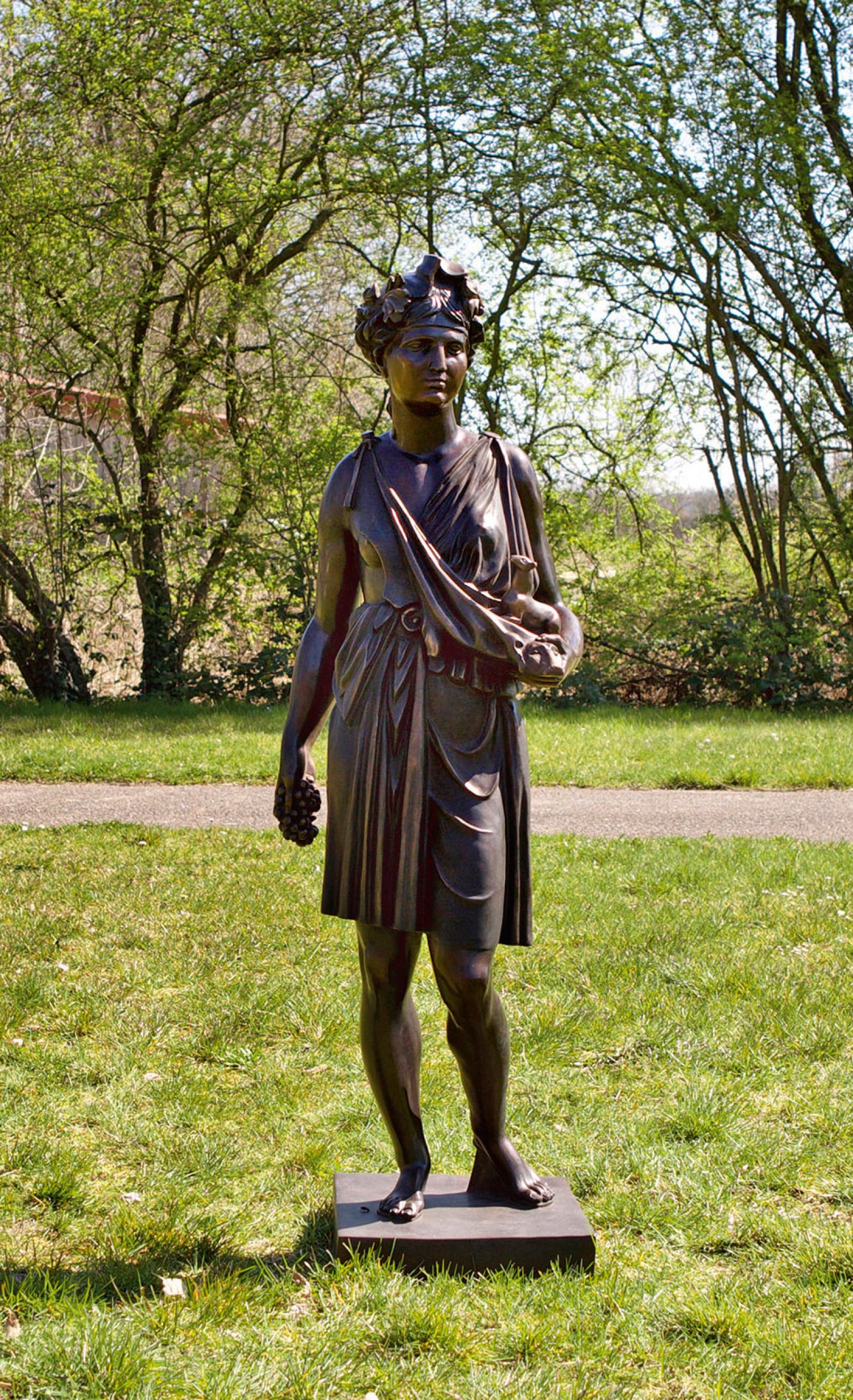 Bronze, dunkelbraun patiniert. Guss 20. Jh., Kunstgießerei Lauchhammer. Einziges bisher bekanntes Exemplar der klassizistischen Statue; der Ende des 18. Jhs. für Schloss Wolkenburg geschaffene Eisenguss ist verschollen. Auf einer rechteckigen Plinthe schreitende Artemis in einem knielangen Gewand als Göttin der Jagd und des Waldes, die mit ihrem linken Arm die Figur einer kleinen Hirschkuh hält, in ihrer rechten Hand ein Bündel Weintrauben. Mattersberger lernte 1767-1778 bei Johann Baptist Hagenauer in Salzburg und Joseph Bergler d. Ä. in Passau; seine künstlerische Ausbildung vertiefte er danach sechs Jahre in Oberitalien, besonders in Mailand bei Giovanni Franchi. In Italien gelangen Mattersberger erste Erfolge durch Statuen-Folgen. 1784 ging er nach Dresden und trat in die Dienste des Grafen Carl Graf von Einsiedel, Besitzer der Eisengießerei in Lauchhammer. Zusammen mit Thaddäus Ignatius Wiskotschill entwickelte er ein Verfahren zur Herstellung großer Eisenkunstgussplastiken im Wachsausschmelzverfahren, u. a. zur Ausführung von Statuen für den Park von Schloss Wolkenburg, der Residenz des Grafen. Mattersberger prägte die künstlerische Entwickung des klassizistischen Eisenkunstgusses in Lauchhammer. H. 125 cm.