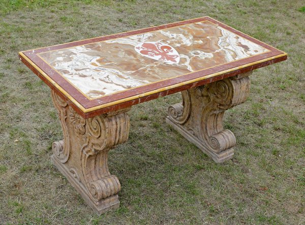 Cremefarbener, rotbrauner, gelber sowie weiß-braun gemaserter Marmor. Balusterförmige Seitenwangen aus gegeneinander gestellten, reliefierten Voluten und zentralen Blütenrosetten auf schmalen Kufen als Träger für rechteckige, umlaufend profilierte Deckplatte. In der Mitte zentrale Kartusche mit Lilienmotiv, von breiter, umlaufender Rahmung begrenzt. H. 80 cm. 150 cm x 75 cm.