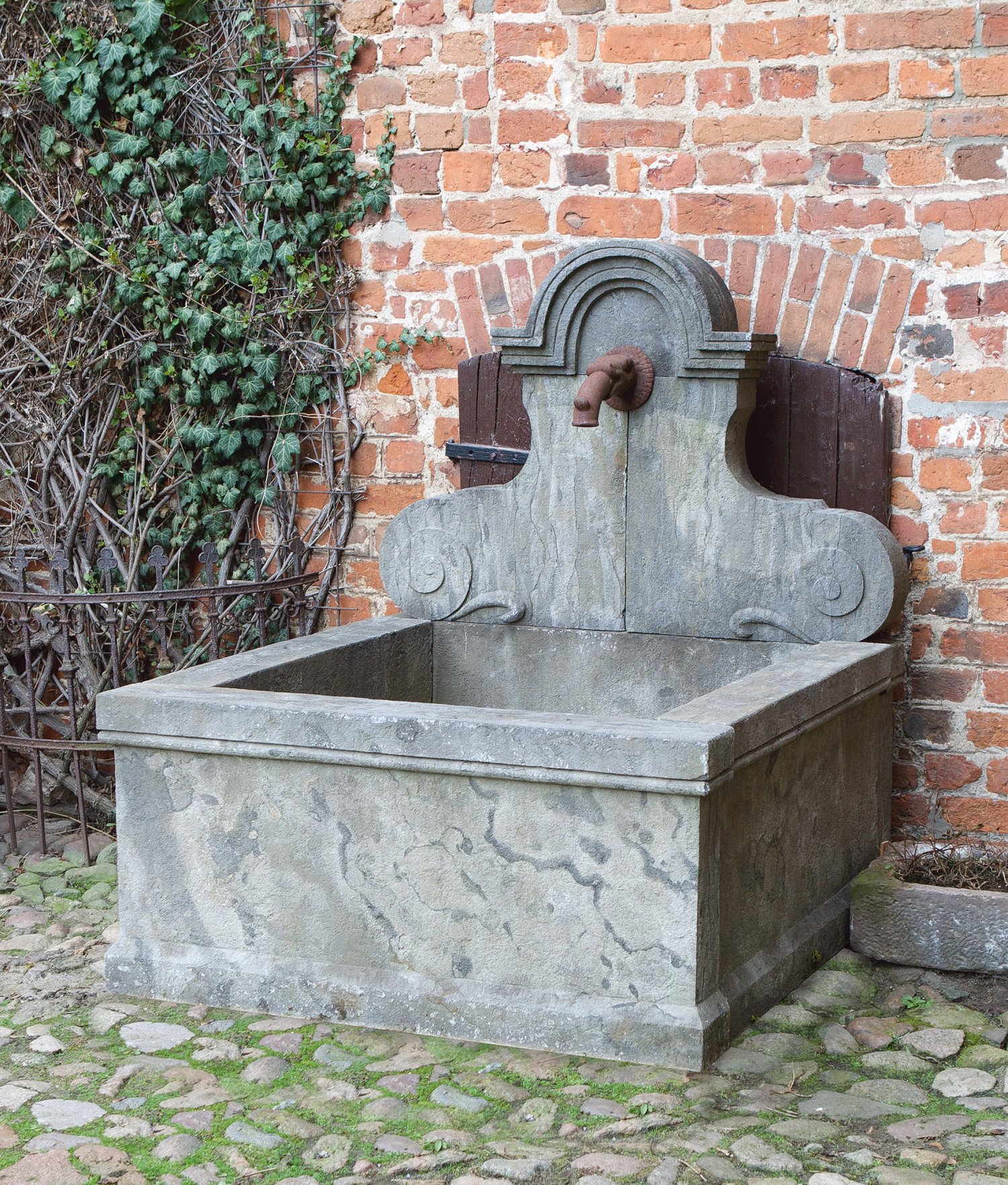 Blaugrauer Kalkstein, sog. Belgischer Granit. Rechteckiger Brunnen mit geschweiftem Wandschild, volutierten Wangen und profilierter Bogenbekrönung. Gusseiserner Hahn. Ca. 149 cm x 124,5 cm x 136,5 cm.