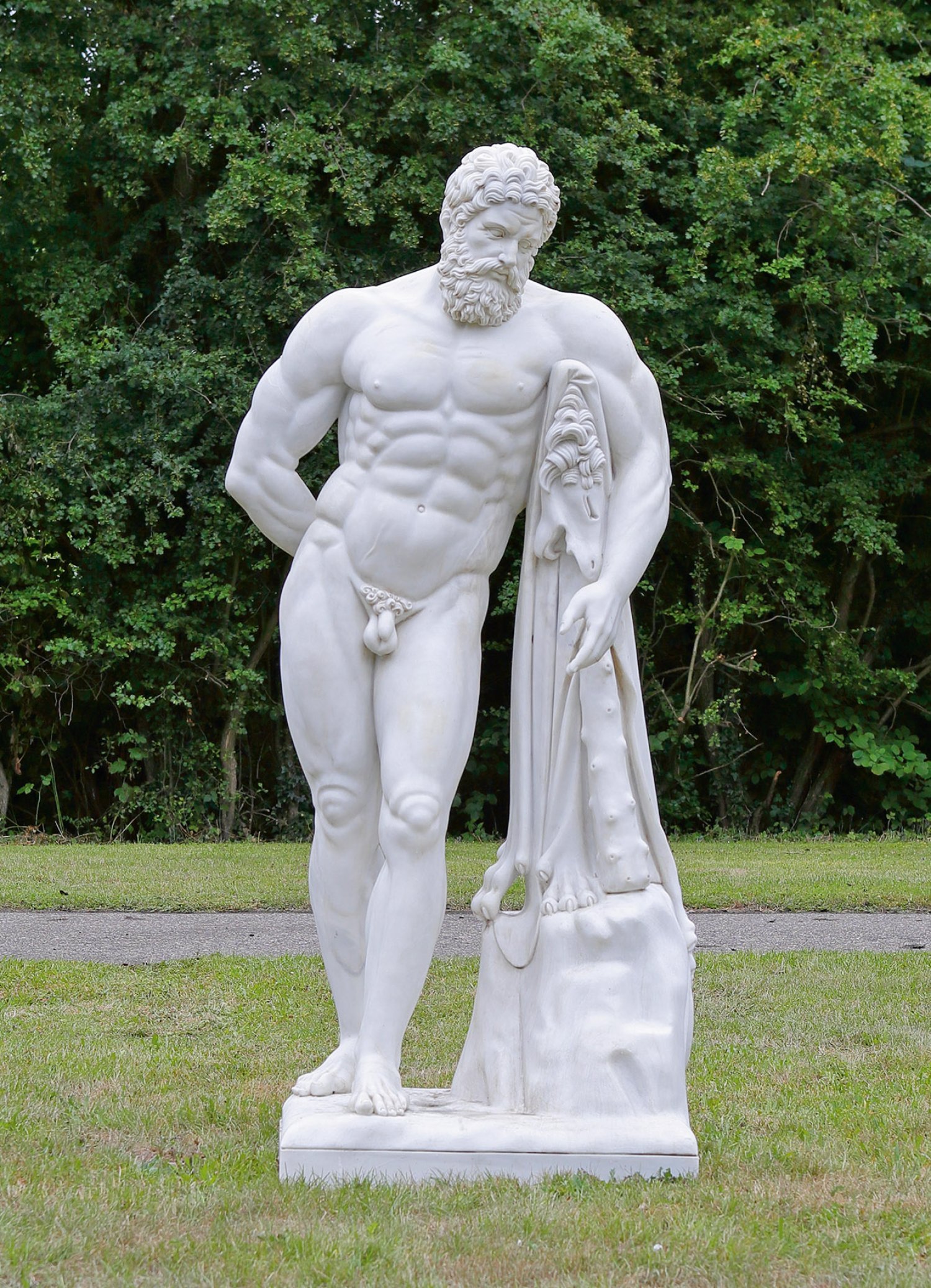 Weißer Marmor. Vollplastische Darstellung des stehenden Herkules nach seinen Heldentaten, sich auf eine Keule stützend. Auf einem Felsen das Fell des nemeischen Löwen, in seiner rechten Hand die drei Äpfel der Hesperiden. Fein ausgeführte Skulptur nach dem berühmten Marmor-Original im Nationalmuseum in Neapel, die zugleich eine der bedeutendsten Skulpturen der Antike ist. Mehr als 200 groß- und kleinformatige Nachbildungen und Variationen des "Herkules Farnese" aus römischer Zeit belegen die Berühmtheit, welche die Statue schon in der Antike hatte. 1546 wurde die Skulptur in Rom wieder entdeckt und kurz danach durch Papst Paul III. im Palazzo Farnese aufgestellt, 1787 gelangte sie nach Neapel. Die Figur wurde bereits im Palazzo Farnese zur Attraktion für die Besucher. Landgraf Karl von Hessen-Kassel sah sie während seiner Italienreise 1699/1700 und ließ nach ihrem Vorbild 1717 vom Gipfel des Karlsberges den monumentalen "Kasseler Herkules" als 8,25 m hohe Kupferkopie in Kassel aufstellen. Sogar Goethe erwähnt den "Herkules Farnese" in seiner Italienischen Reise (1786/88). Einige Jahre später erweckte die Berühmtheit des "Herkules Farnese" auch die Sammlerbegierde von Napoleon, 1799 stand sie schon zum Abtransport nach Paris bereit, was nur durch die Revolution in Neapel verhindert wurde. H. 186 cm.