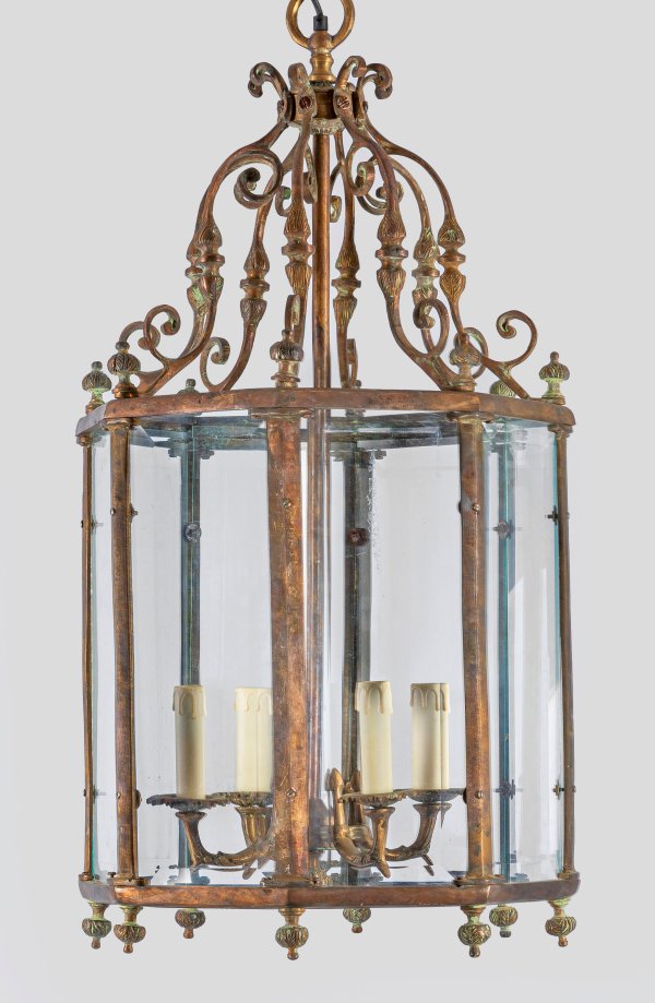 4-flg.; Bronze, patiniert und farbloses Glas. Gekanteter Korpus aus schmalen Streben mit facettierten Glaseinsätzen. Bekrönung aus stark geschwungenen, eingerollten Volutenmotiven. Innen schlanker Schaft als Träger für Leuchtmittel. Elektrifiziert. H. 86 cm. D. 42 cm.