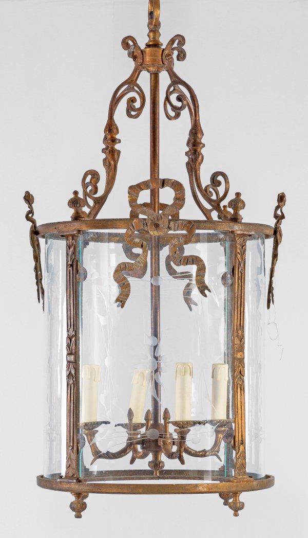 4-flg.; Bronze, patiniert und farbloses, teilw. ornamental geätztes Glas. Zylinderförmiger Korpus aus schmalen Streben mit Schleifenbekrönungen. Oberer Abschluss aus stark geschwungenen, eingerollten Volutenmotiven. Innen schlanker Schaft als Träger für Leuchtmittel. Elektrifiziert. H. 88 cm. D. 44 cm.