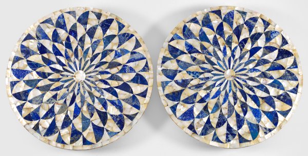 Lapislazuli und Perlmutter. Runde Platten. Flächendeckender Dekor aus mosaikartig angelegtem Rosettenmotiv. Umlaufend schmale Rahmung. D. 60 cm.