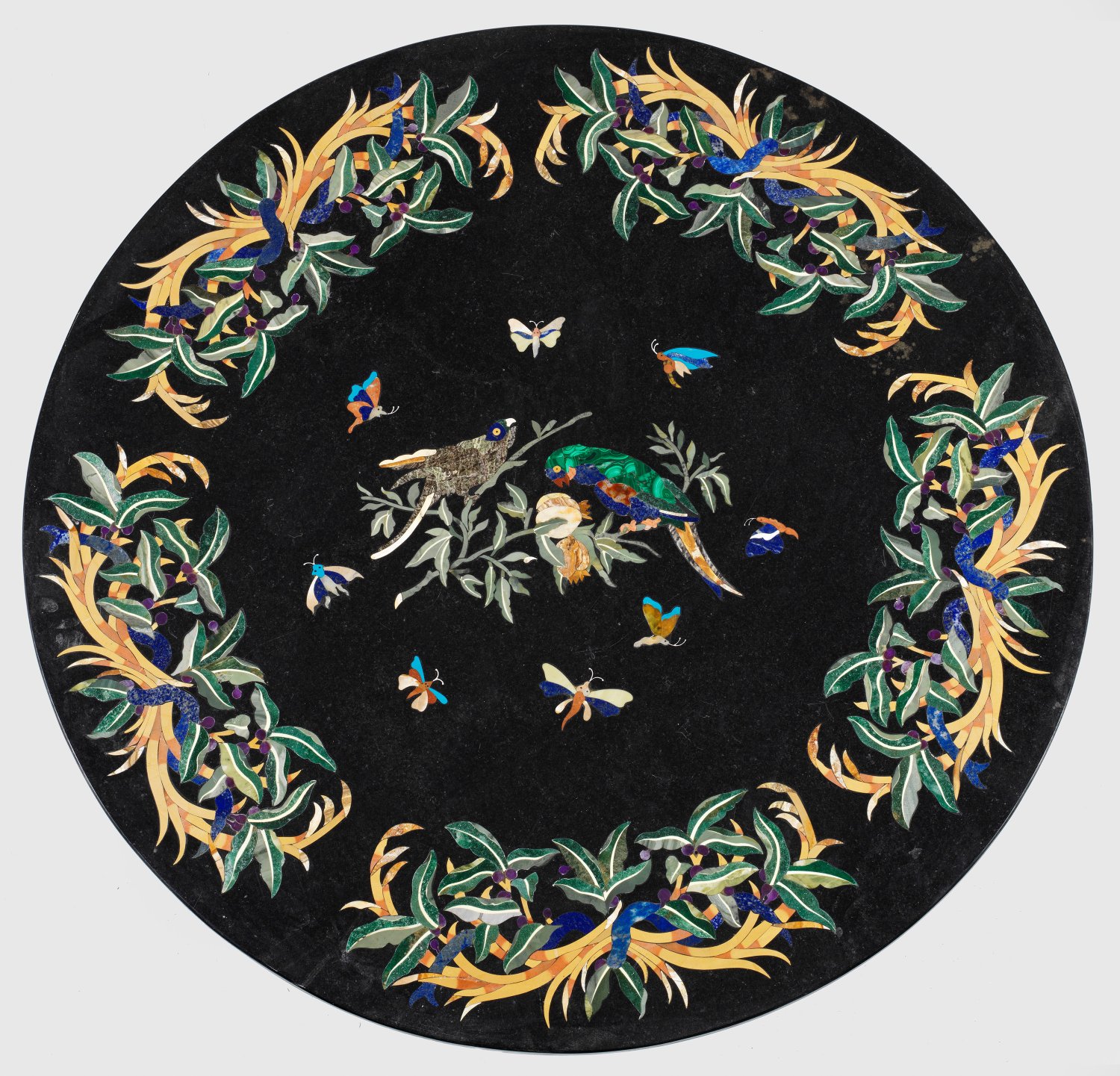 Anthrazitfarbener Marmor mit reichen Einlagen aus Lapislazuli, Malachit sowie unterschiedlichen Marmor- und Achatsorten in Gelb- und Grüntönen. Runde Platte. Auf schwarzem Fond zentraler Zweig mit Papageienpaar, umgeben von unterschiedlichen Schmetterlingen. Umlaufend große Blattarrangements. D. 91 cm.