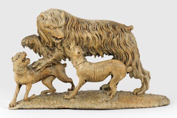 Nadelholz, vollrund geschnitzt. Überaus fein, detailreich und tief geschnitzte Gruppe eines Bären im Kampf mit zwei Jagdhunden. Charakteristisches Werk J. G. Schwanthalers, bekannt als "Meister der Kleinplastik", von dem meist Werke mit profanen Themen wie der Jagd erhalten sind. Aufträge der Kirche waren für die Bildschnitzer des Spätrokoko in Österreich sehr selten geworden, was auf die Säkularisation unter Josef II. und die damit einhergehende Schließung von ca. 3200 Kirchen und Klöstern zurückzuführen ist. Rest.; 12,5 cm x 22 cm.