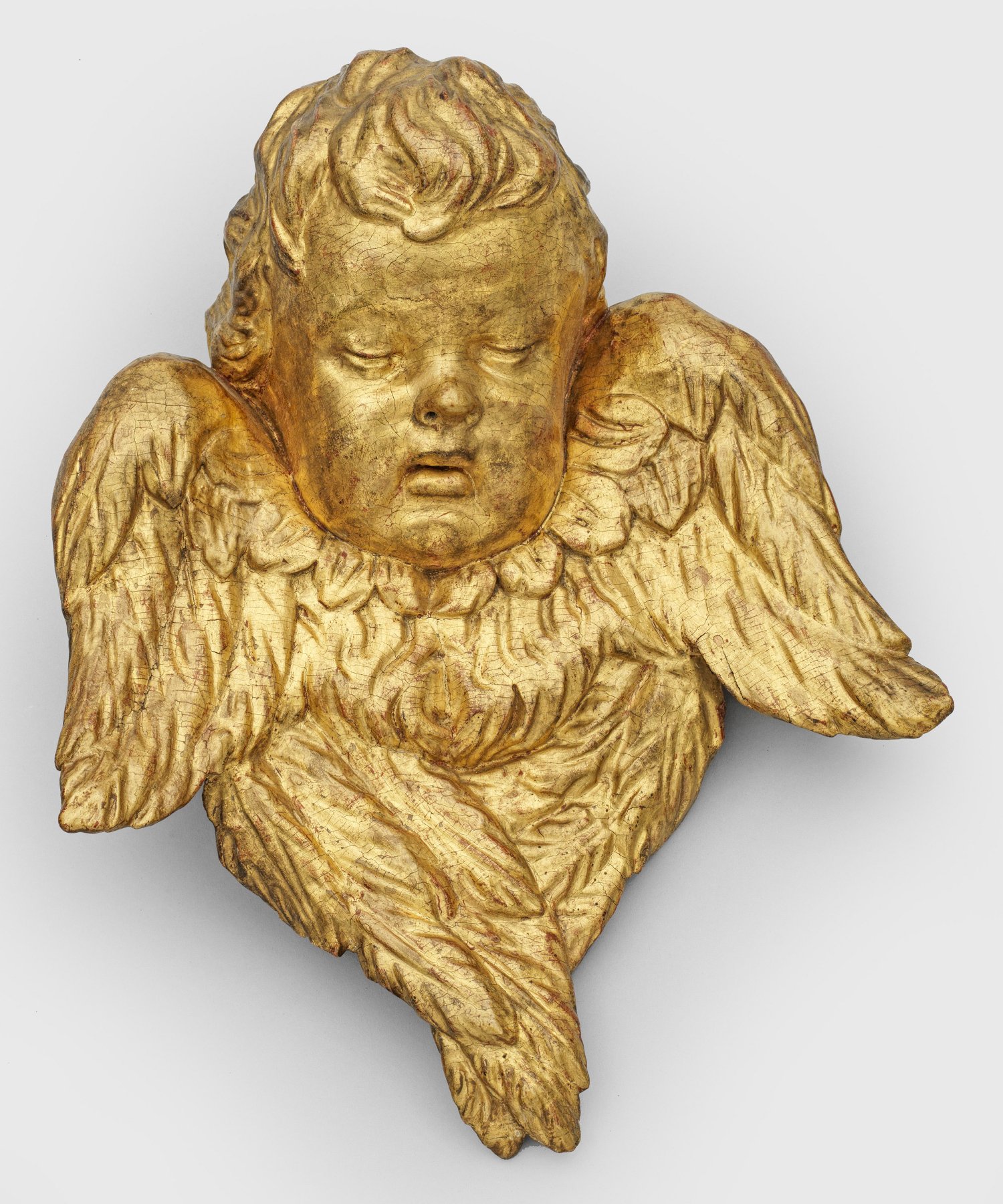 Lindenholz, vollplastisch geschnitzt und vergoldet. Schwebender Engel mit gelocktem Haar, seinen Körper hinter den Flügeln verbergend, den Kopf nach unten gewandt. Wohl ursprünglich als Beiwerkfigur eines Altarretabels weit oben angebracht, die Gläubigen von dort betrachtend. Fassung minim. besch.; H. 43 cm.