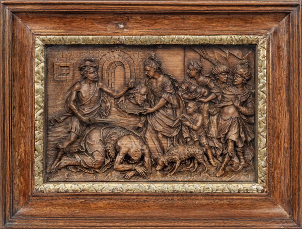 Lindenholz, geschnitzt. Überaus fein und detailreich ausgeführtes Relief mit einer szenischen Darstellung der Enthauptung von Johannes des Vorläufers bzw. der Übergabe des Hauptes an Salome. Beschrieben wird das Martyrium des Heiligen in den Texten von Matthäus, Markus und Lukas. Johannes war von König Herodes ins Gefängnis geworfen worden, weil er gegen dessen Entscheidung gepredigt hatte, Herodias, die Frau seines Bruders, zu heiraten. Salome plante mit ihrer Mutter, Johannes loszuwerden, tanzte verführerisch vor Herodes und forderte danach als Belohnung den Kopf von Johannes dem Täufer. Herodes stimmte widerwillig zu, und der Kopf des Heiligen wurde Salome auf einer Platte überreicht. Minim. rest.; 27 cm x 38 cm.