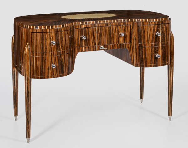 Palisander furniert sowie Einlagen aus Ahorn und lackiertem Ziegenleder. Bombierter Korpus auf gekanteten, spitz zulaufenden Beinen. In der konkav eingezogenen Front flaches Kniefach sowie fünf Schubladen unterschiedlicher Größe. Dem Korpus entsprechende Deckplatte. Allseitig flächendeckende Furnierfelder, vertikal durch schmale Einlagen begrenzt. H. 85,5 cm. 122 cm x 70 cm.