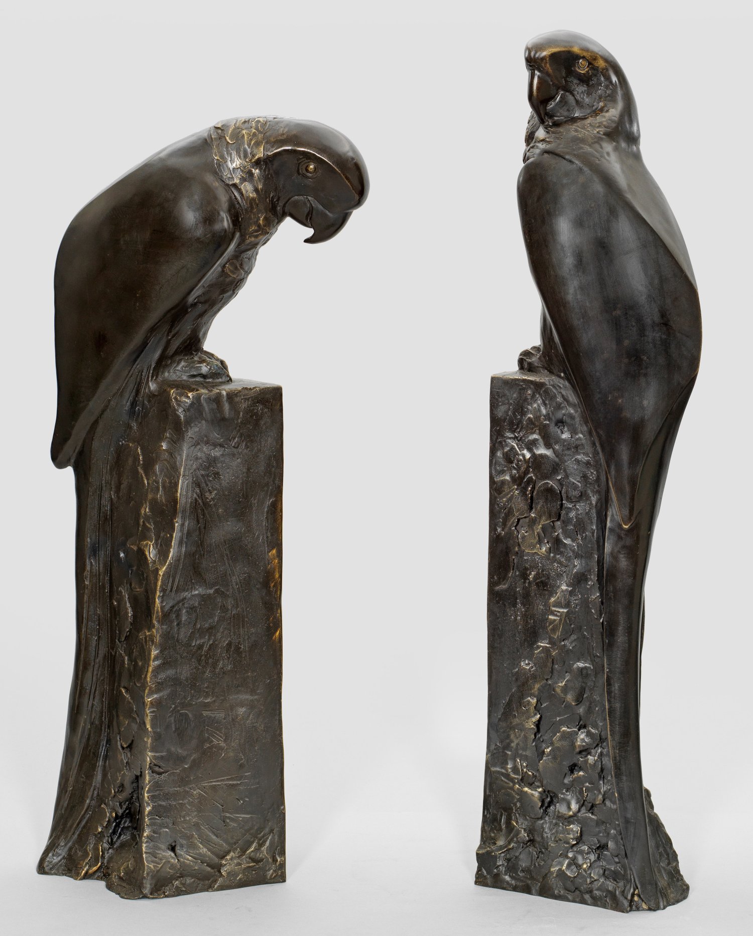 Gegenstücke. Bronze, dunkelbraun patiniert. Auf hohen, stelenartigen, an einer Wandungsseite reliefierten Sockeln sitzende Papageien mit erhobenem bzw. gesenktem Kopf. Moderne, im Art Déco-Stil ausgeführte, vollplastische Darstellungen. Zeitgenössische Güsse Ende 20./Anfang 21 Jh.; H. 75 cm-83 cm.