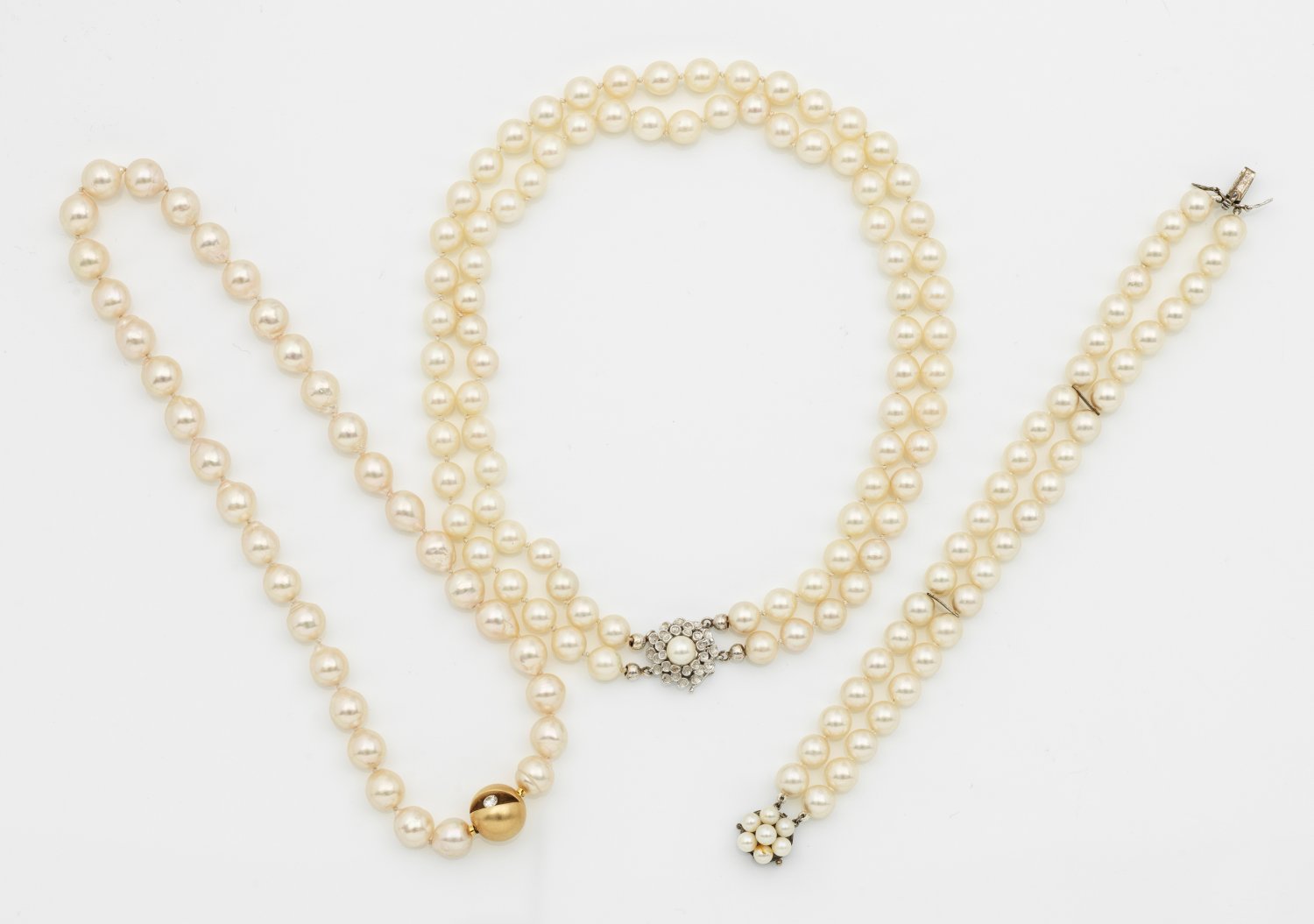 Bracelet and two necklaces set with white culture pearls approx. 8 - 10 mm, clasps in 8 k white gold, 18 k gold and silver, set with pearls and a diamond.
