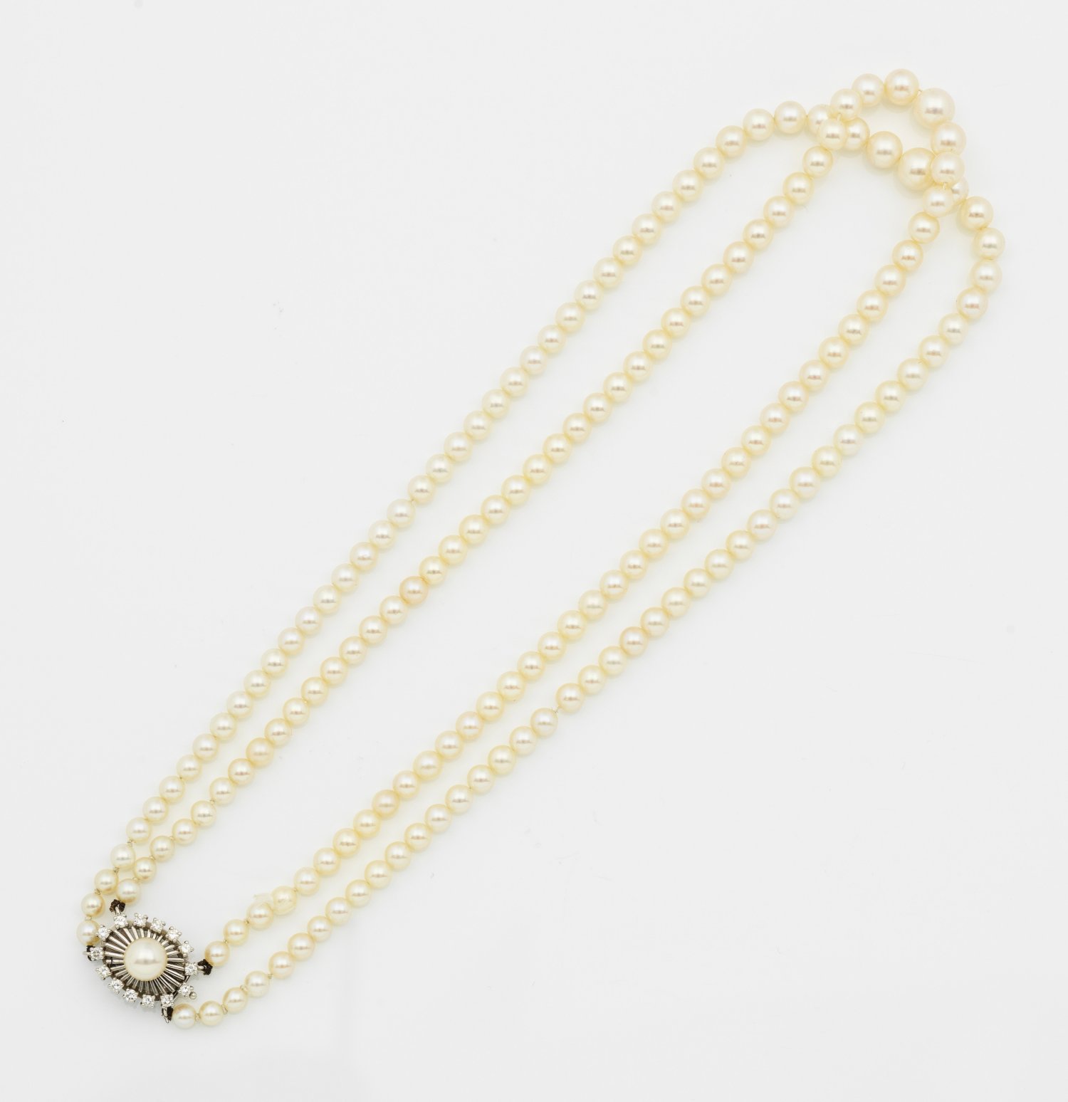 Weißgold, gest. 750. Zweireihige Kette aus weißen Zuchtperlen von ca. 4,5 - 8 mm in sehr farbintensivem rosé-grün changierendem Lüster, ovale Schließe zentral besetzt mit korrespondierender Zuchtperle von ca. 8 mm, entouriert von 14 Diamanten von zus. ca. 0,49 ct.