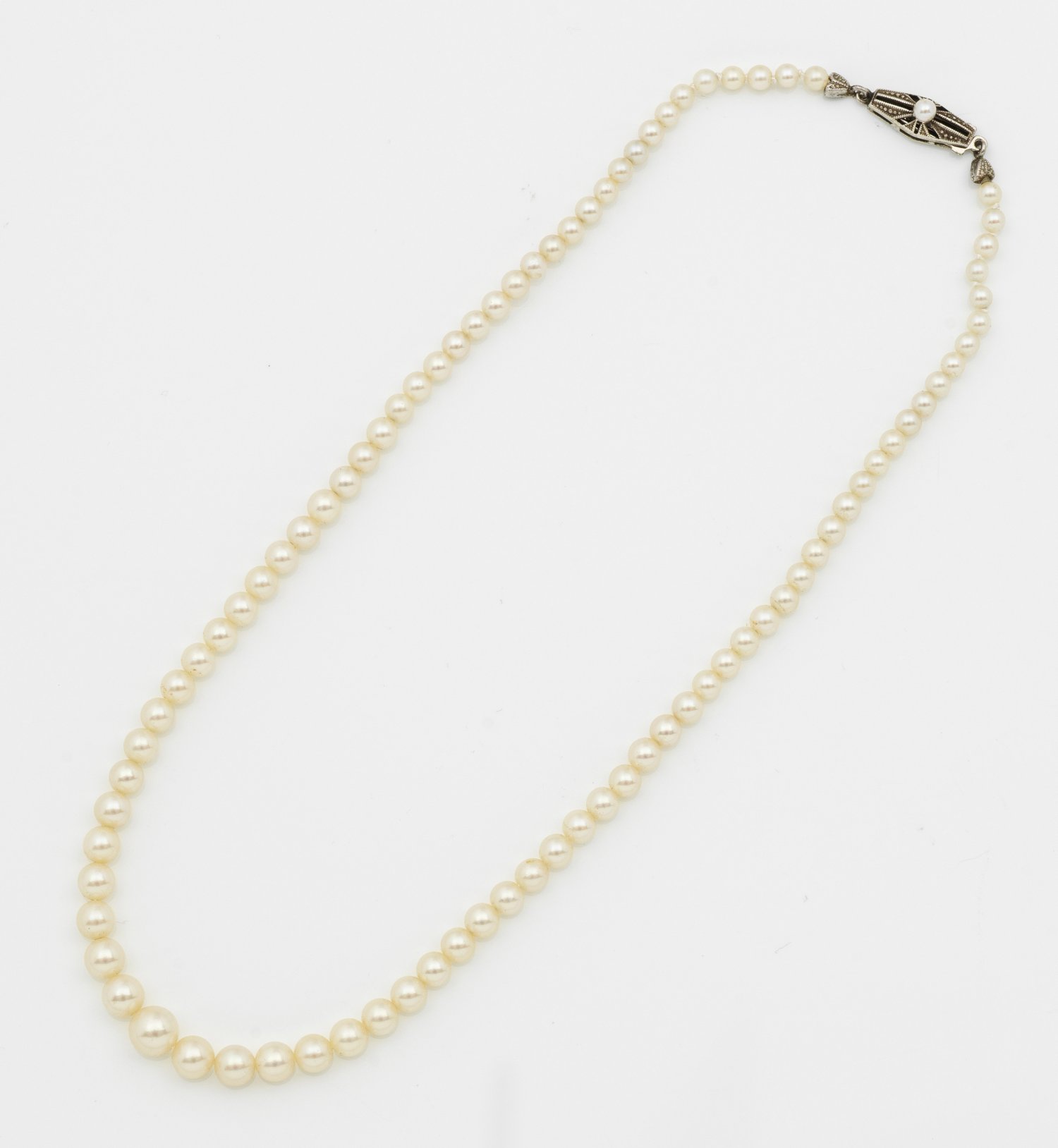 Silber, gest. 835. Einreihige Kette aus weißen Zuchtperlen im Verlauf von ca. 4 - 7,5 mm in zart rosé-grün changierendem Lüster. Navetteförmige Steckschließe. Steinbesatz fehlend. L. ca. 37 cm.