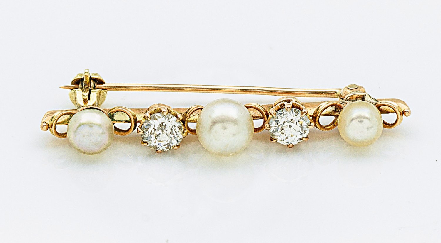 Brooch set with 3 pearls approx. 4 mm - 6 mm and 2 antique diamonds approx. 0,40 ct., in 14 k gold.