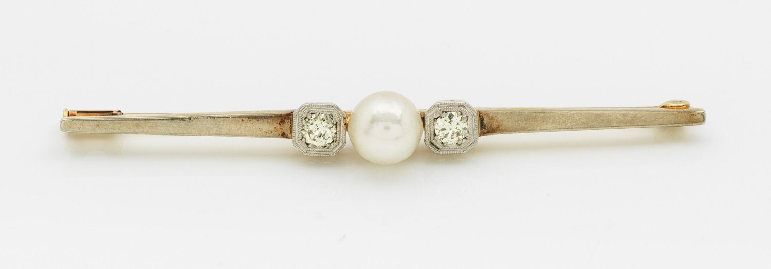 Gelbgold, gest. 585. Zentral besetzt mit einer weißen Zuchtperle von ca. 7 mm, flankiert von 2 Altschliffdiamanten von zus. ca. 0,20 ct.; Gew. ca. 4,29 g.