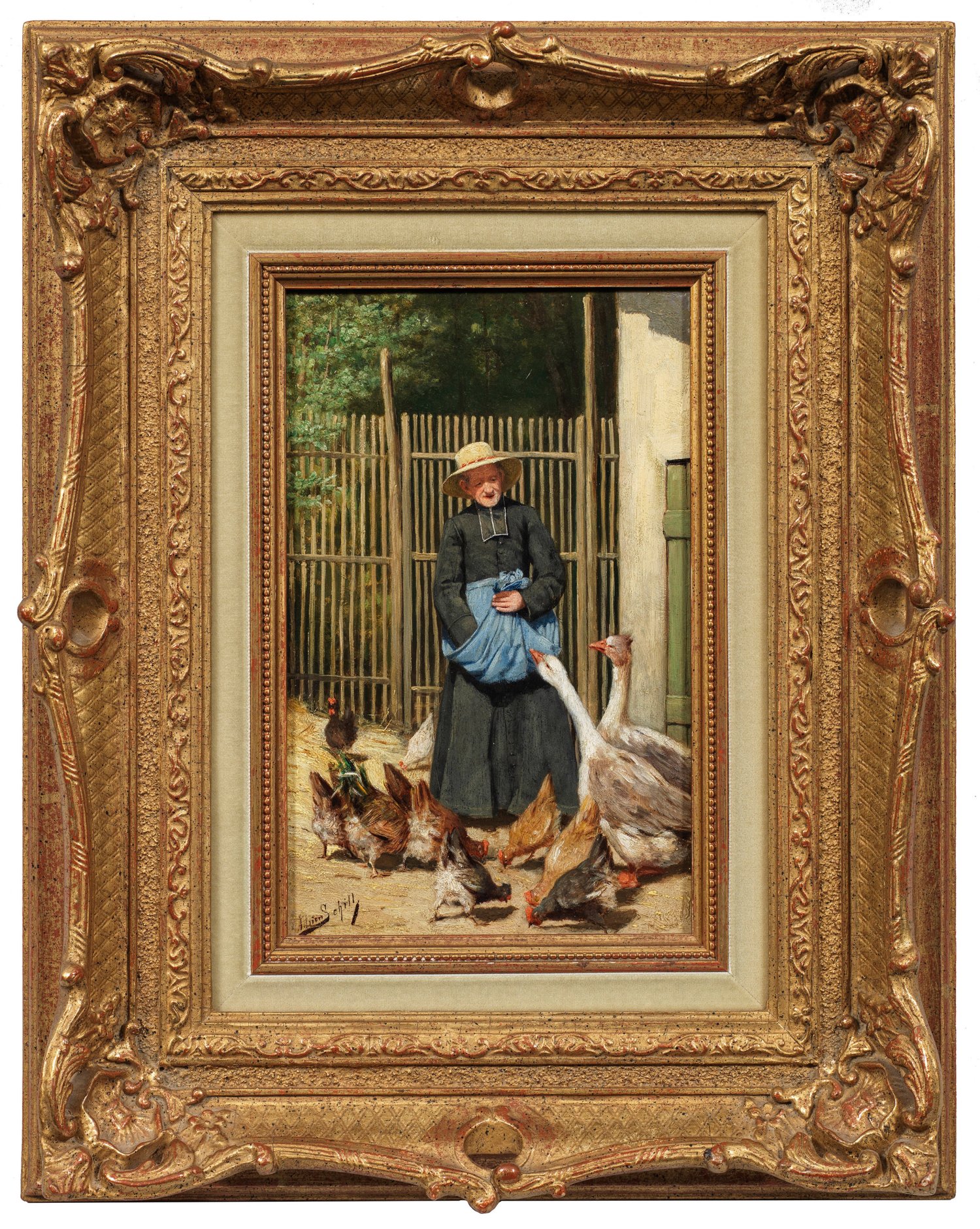 In leuchtendem, sommerlichem Kolorit gemalte Darstellung eines Geistlichen mit breitem Strohhut beim Füttern von Hühnern und Gänsen. Subtil charakterisiertes, heiteres Genrebild des Niederländischen Künstlers, der 1873 - 1874 bei Jean François Portaels in Brüssel und 1881 bei Frans Stracké in Scheen lernte. Sein Oeuvre umfasst überwiegend Genredarstellungen und Bildnisse. Öl/Holztafel. L. u. sign.; Verso bez. und betitelt. 21 cm x 13,5 cm. Rahmen.