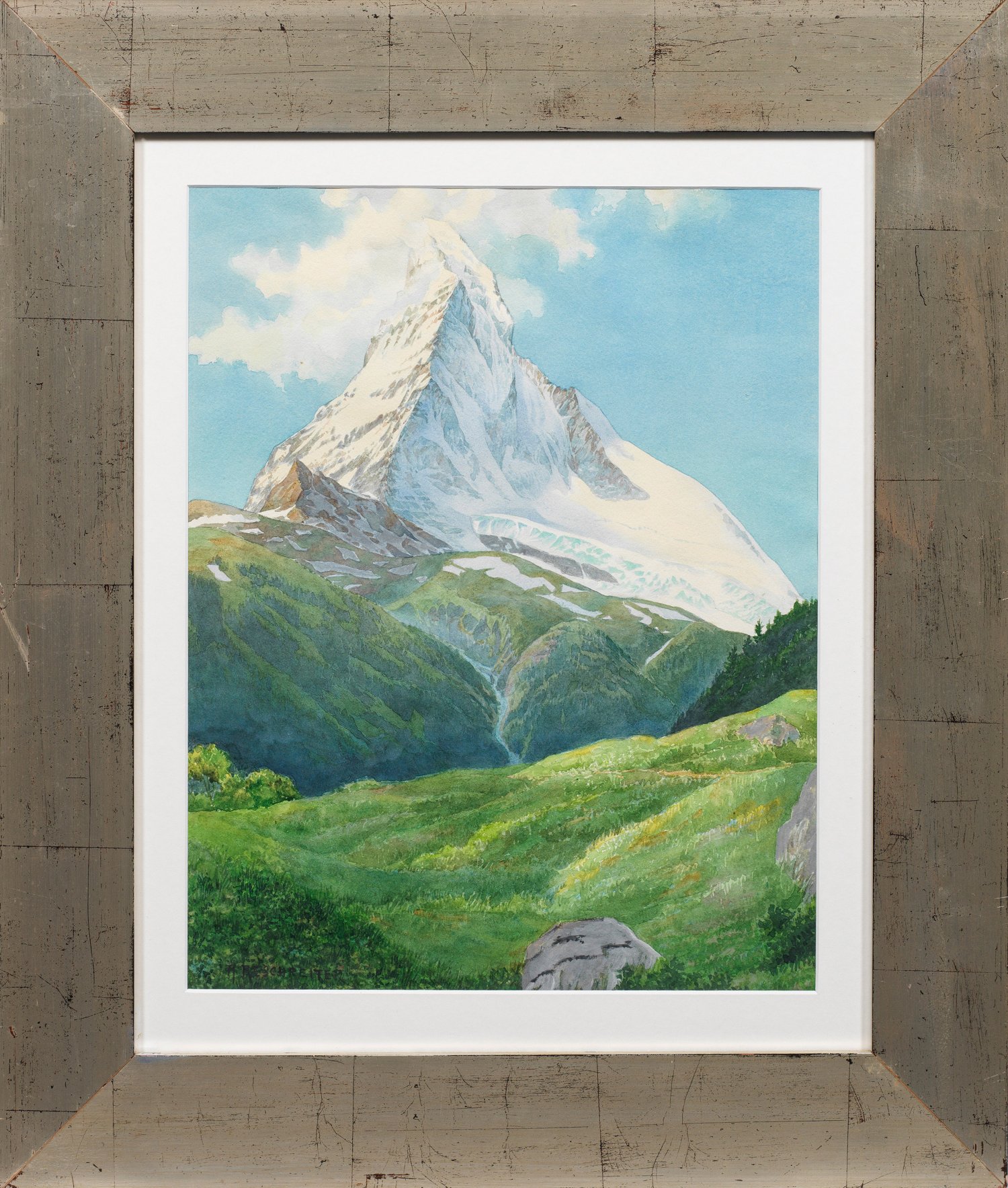 Atmosphärische, höchst naturgetreue Darstellung von satt grünen, sommerlichen Bergwiesen, in deren Hintergrund monumental das schneebedeckte Matterhorn aufragt. In Motiv und Stil typische Hochgebirgslandschaft Reschreiters, der an der Münchener Akademie bei Gabriel v. Hackl studierte. Aquarell/Bütten. L. u. sign. Passepartoutausschnitt 47 cm x 37 cm. Rahmen.