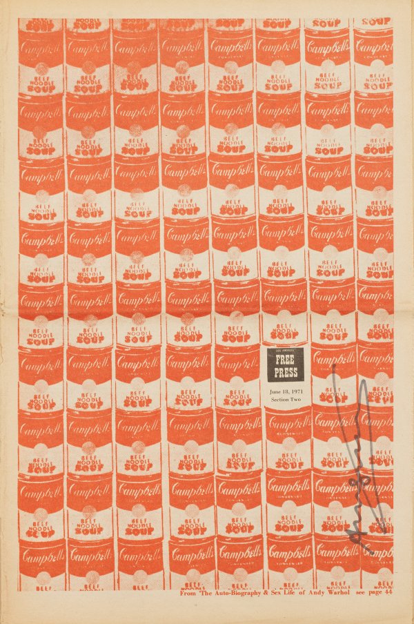 Ausgabe der Wochenzeitung "Los Angeles Free Press" vom 18. Juni 1971, Teil 2 (dabei: Seite 41 - 62, Seite 43/44 zweifach). Titelblatt mit Reproduktion von Andy Warhol's '100 Campbell's Soup Cans (Beef Noodle)' von 1962. Auf Seite 44 ist eine Rezension über die Autobiographie Warhols von John Wilcock abgedruckt. Auf der Titelseite r. u. mit schwarzem Faserstift gestürzt sign.; Leichte, altersbedingte Läsuren u. Verfärbungen. 45 cm x 29,0 cm.