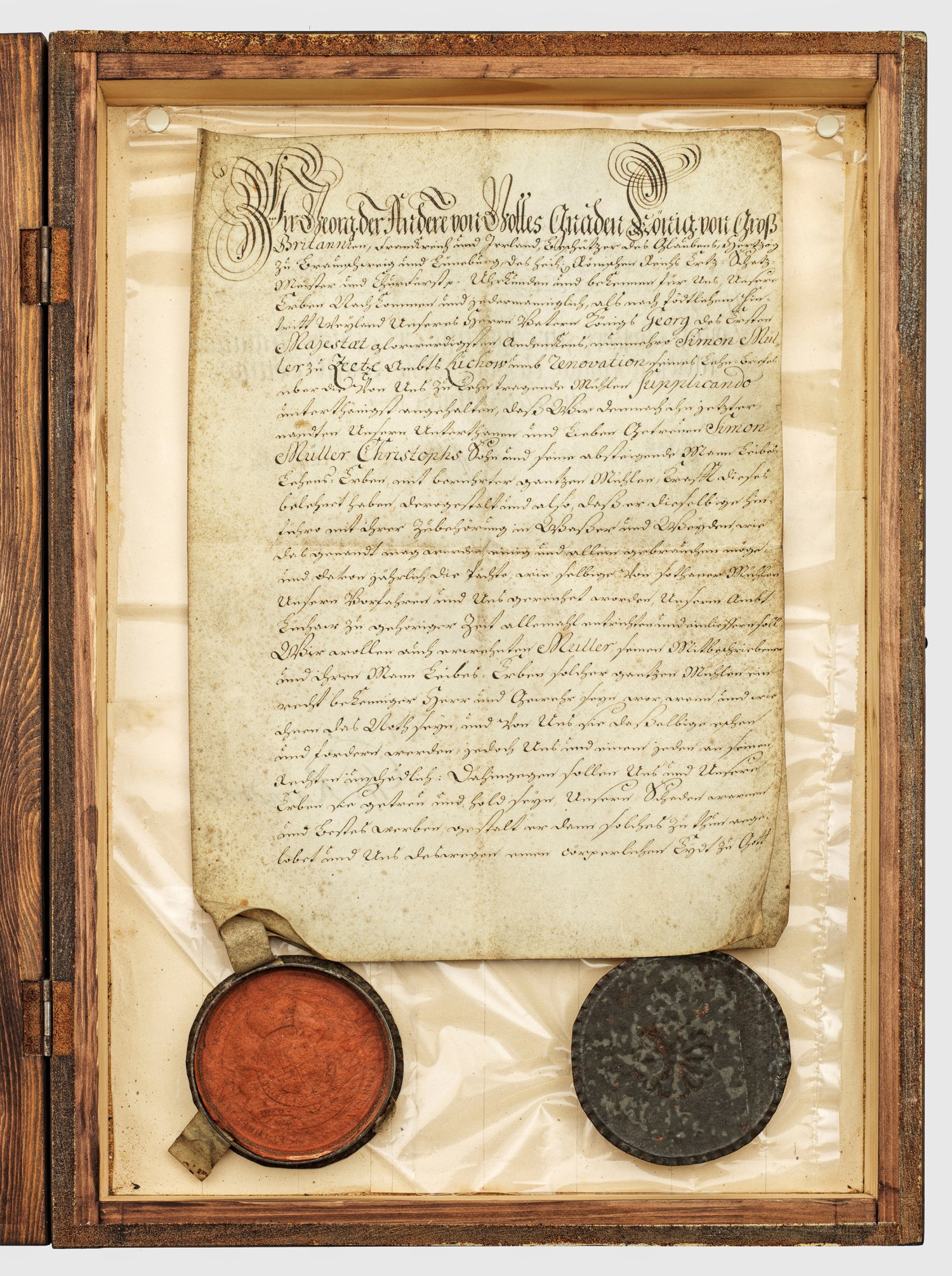 Zweiseitige, handschriftliche Urkunde auf Pergament. Ausgestellt im Namen von Georg II. Kurfürst von Hannover, König von Großbritannien und Irland (1683-1760) durch den Geheimrat in der Kriegskanzlei Otto Christian von Lenthe (1706-1750). Dat.; Daran befestigt eine runde Kapsel aus Zinn mit geprägtem Wappen von Georg II. in hellrotem Wachs. Guckkasten aus Holz. Urkunde 50 cm x 34,5 cm. Kapsel-D. 9,4 cm.