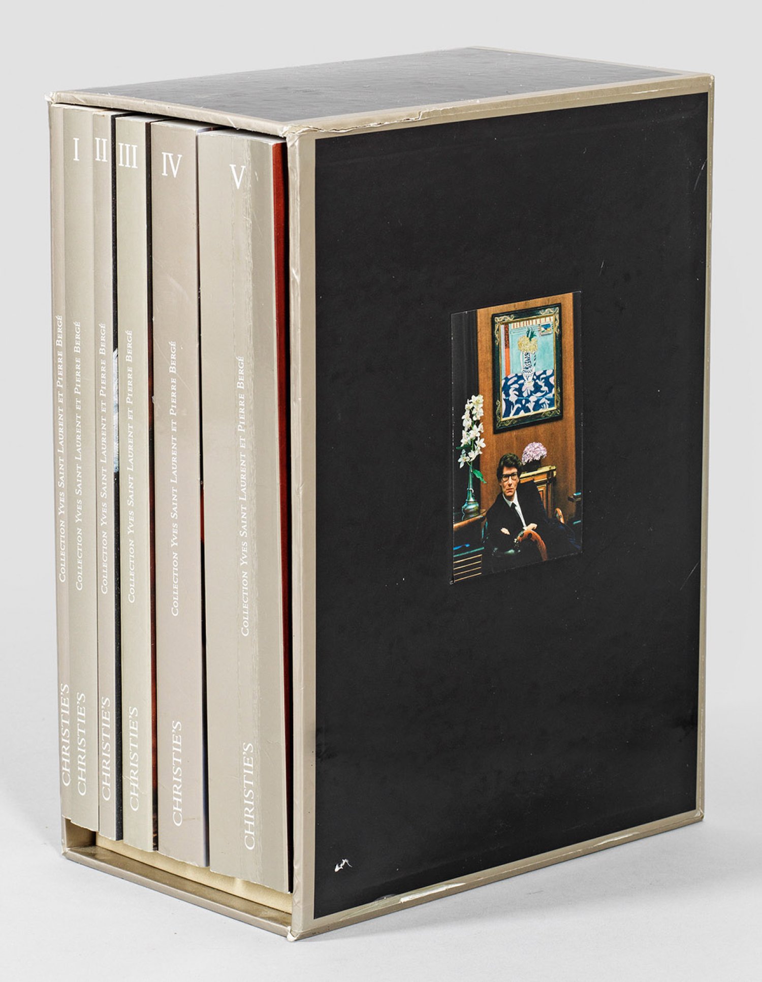 Sechs Bände im Schuber. Auktionskatalog zur Versteigerung der Sammlung von Yves Saint Laurent und Pierre Bergé bei Christie's, Paris 2009. Band I "Art Impressionniste et Moderne". Band II "Tableaux et Dessins Anciens et du XIX. Siècle", Band III "Orfèvrerie, Miniatures et Objets de Vertu", Band IV "Arts Décoratifs du XX. Siècle", Band V "Sculptures, Objets d'Art, Art d'Asie, Archéologie et Mobilier" und Band VI "Guide D'exposition". Mit handschriftlicher Widmung. Nicht kollationiert. Minim. Gebrauchsspuren. H. 32,5 cm. 15,5 cm x 23,5 cm.