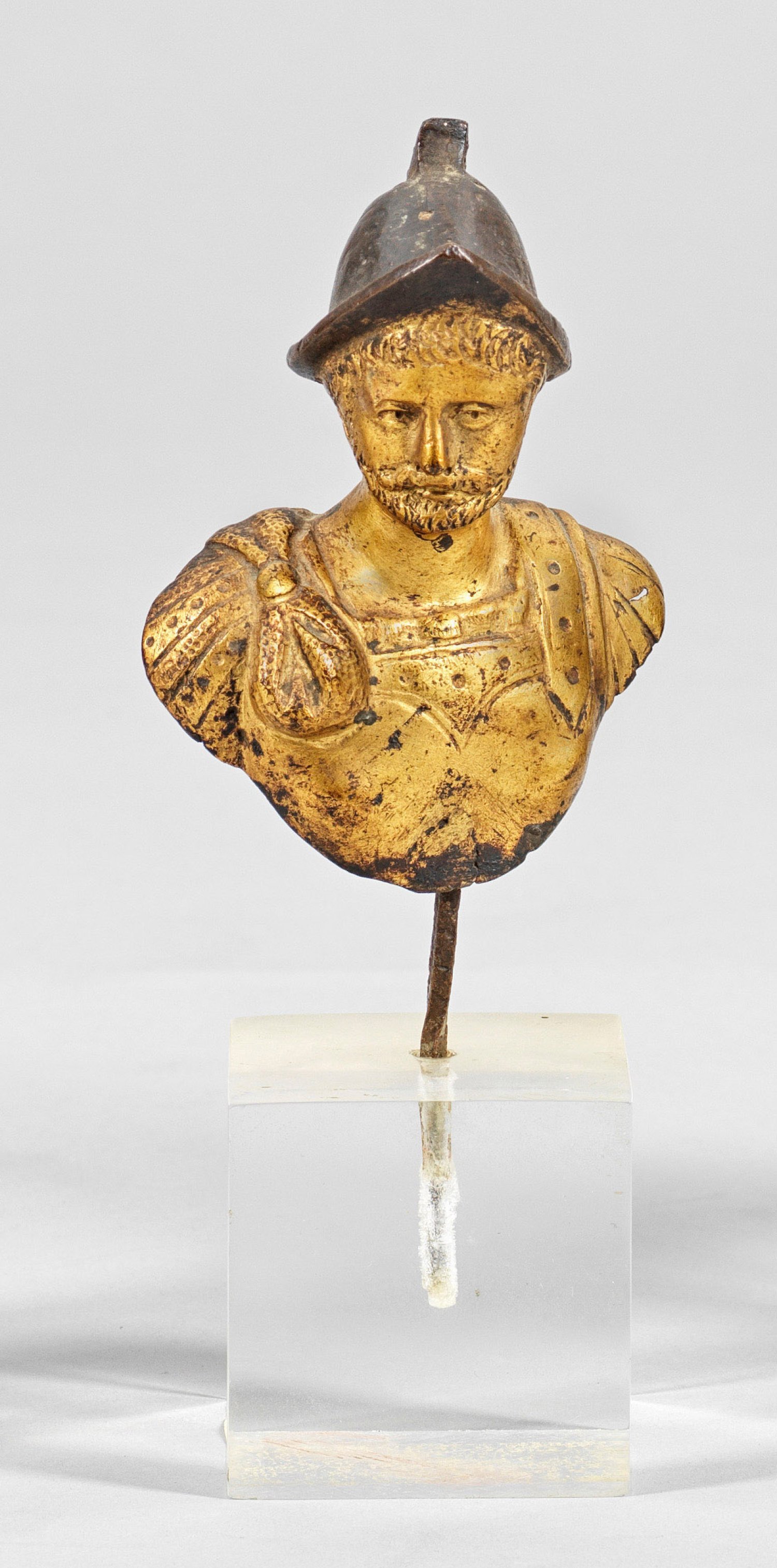 Bronze, vergoldet bzw. dunkelbraun patiniert; moderner Acrylglas-Sockel. Nach römischem Vorbild gestaltete vollplastische Büste, wohl entstanden im 1. Viertel des 17. Jhs. in Venedig. Bronze-H. 9,5 cm (ohne Dorn).