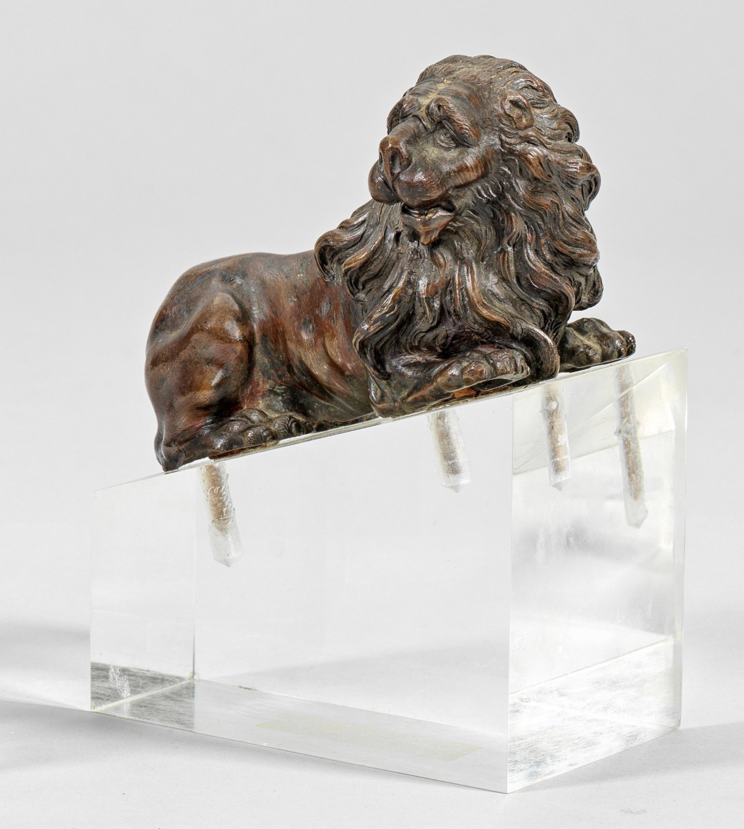 Bronze, dunkelbraune Patina; neuzeitlicher Acrylglassockel. Vollplastische Darstellung mit nach rechts gewandtem Kopf und kraftvoll ziselierter Gestaltung von Mähne und Tatzen. Stilistisch ist die Figur sicherlich italienischer und wahrscheinlich Florentiner Herkunft. Parallelen zeigten sich hierbei zu Löwendarstellungen Giambolognas bzw. aus seiner Werkstatt, überdies zu bedeutenden Schülern wie Giovanni Francesco Susini (1585 - 1653), der die Tradition Giambolognas weiterführte. Bronze-H. ca. 8,2 cm.