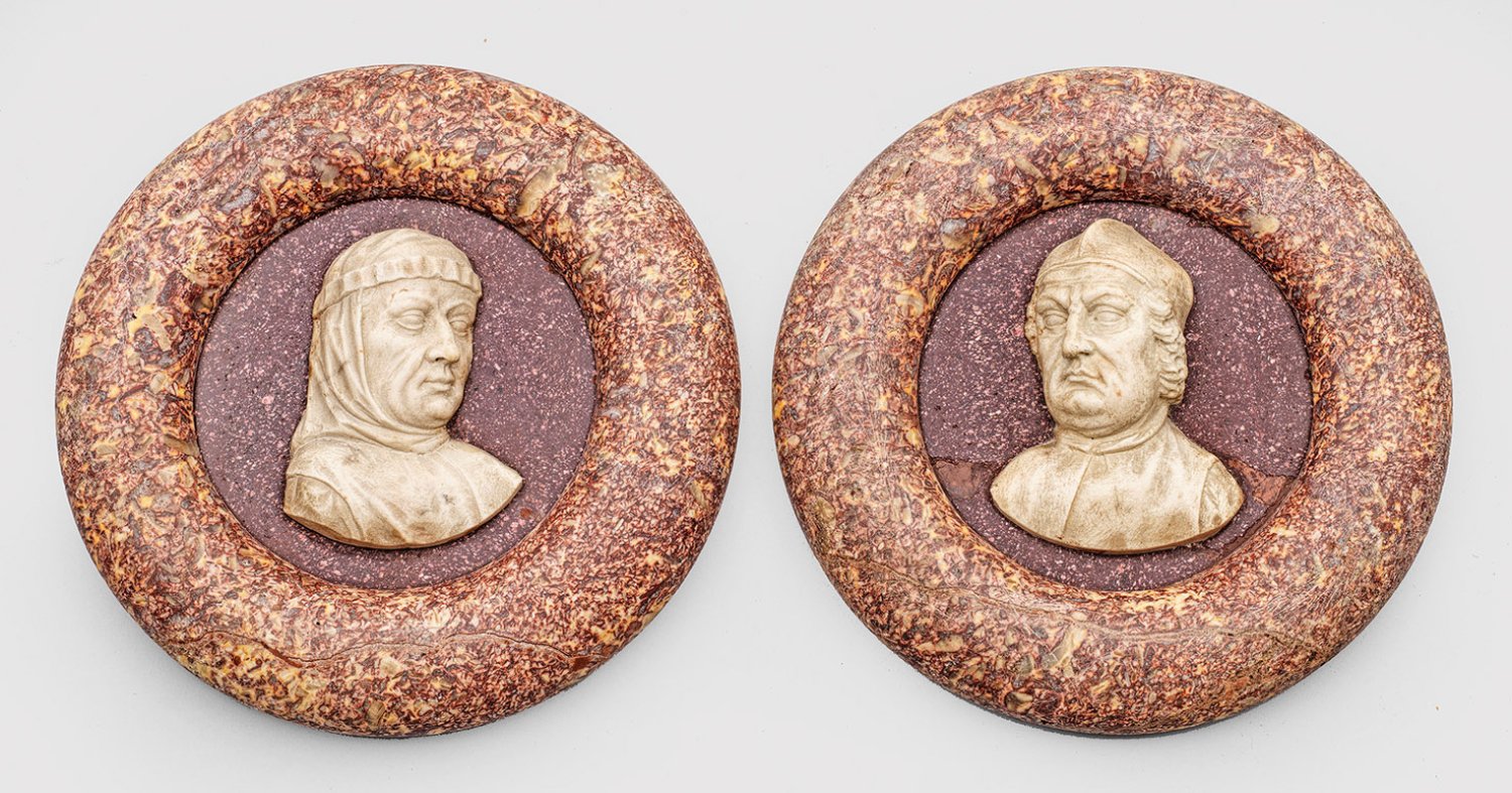 Weißer Marmor, Hintergrund und Rahmung aus dunkelrotem, hell geflecktem bzw. rotem und gelblichem, gefleckten und geädertem Marmor. Reliefplastische Darstellung von Petrarca und eines weiteren humanistischen Dichters oder Gelehrten im Halb- bis Dreiviertelprofil. Rahmen und Hintergrund partiell ger. rest.; D. 24 cm.