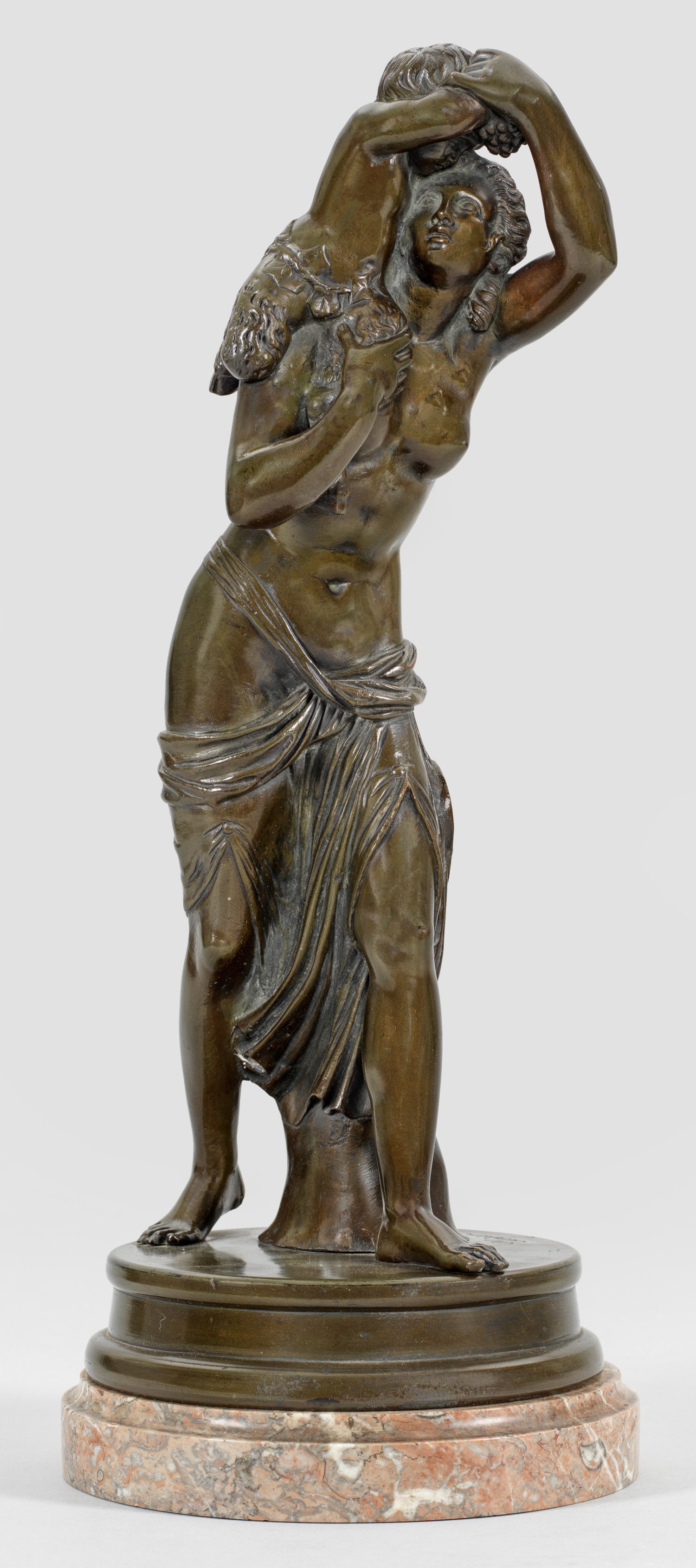 Bronze, braun patiniert; Marmorsockel. Künstlerbez. "Clodion" nach der alten Zuschreibung an Claude Michel gen. Clodion (1738 - 1814). Guss Ende 19. Jh. nach der bekannten Marmorskulptur, die 1777 auf dem Salon gezeigt wurde und sich seit 1850 im Louvre befindet (Inv.-Nr. N 15512). Der bedeutende französische Bildhauer gewann 1769 den Prix de Rome für Bildhauerei, 1777 wurde er in die Académie Royale de Peinture et de Sculpture aufgenommen, bis 1812 gehörte er zu den regelmäßigen Ausstellern auf dem Salon. Ges.-H. 48,5 cm.