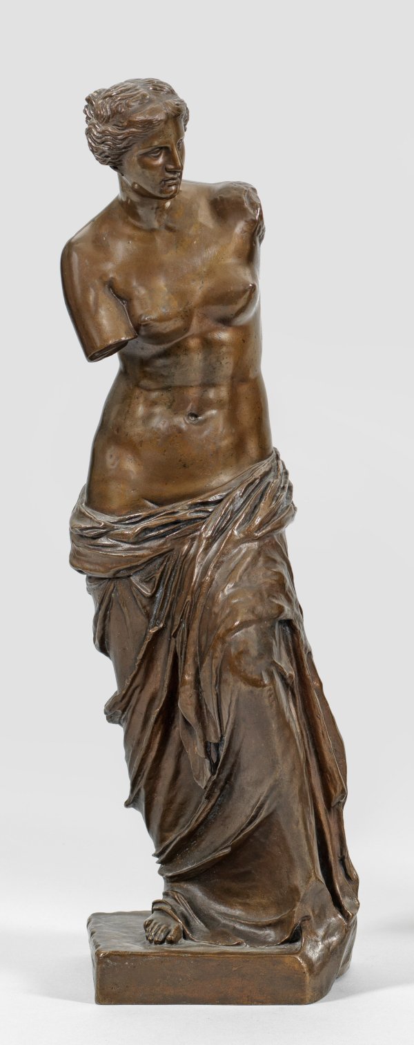 Bronze, dunkelbraun patiniert. Guss Ferdinand Barbedienne, Paris, 19. Jh.; Gießerstempel "F. BARBEDIENNE FONDEUR" sowie Stempel "REDUCTION MECANIQUE (/) A. COLLAS (/) BREVETÉ" mit Porträt von Achille Collas. Im Detail fein ausgeführter, verkleinerter Guss nach der berühmten Marmorskulptur im Louvre. Die 1820 entdeckte, Ende des 2. Jhs. v. Chr. entstandene Skulptur ist eines der bedeutendsten Beispiele hellenistischer Kunst und beeindruckt bis heute durch ihre Harmonie und Schönheit. H. 47 cm.