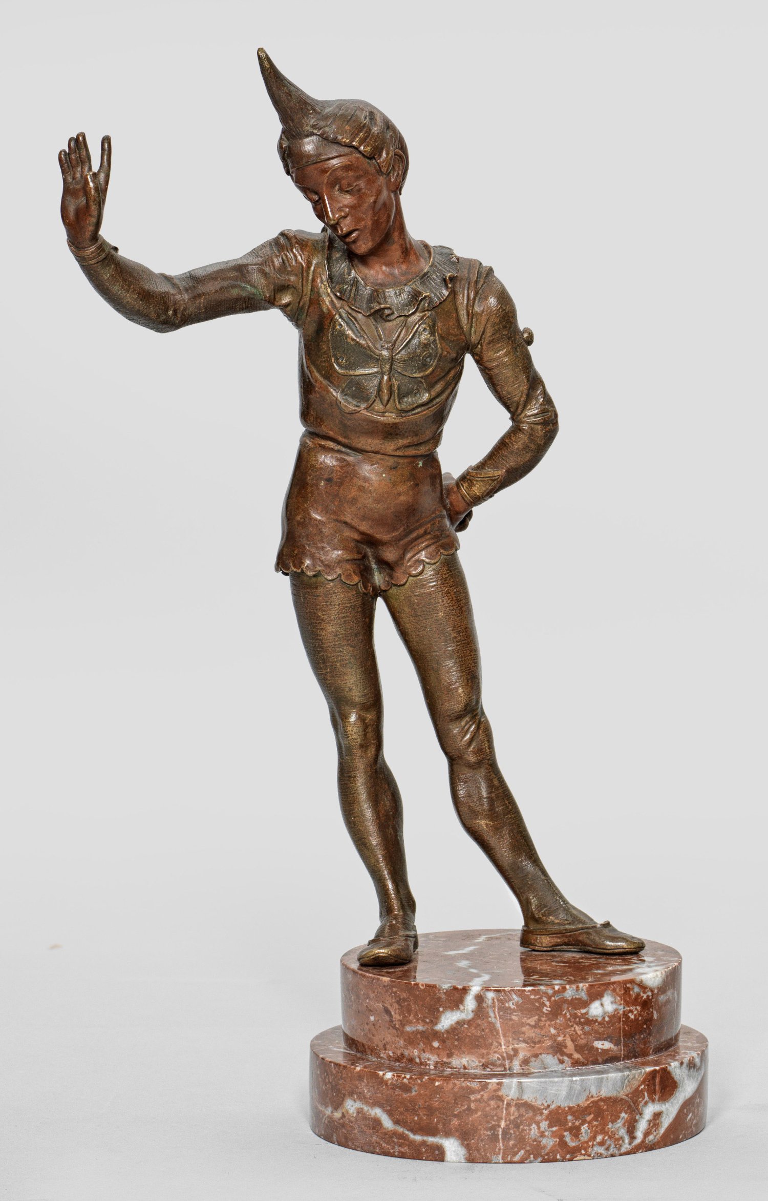 Bronze, braun patiniert. Rote, hell geäderte, abgetreppte Plinthe. Fein und detailreicher Guss des 19. Jhs.; In einer graziösen Pose stehender, junger Mann in einem Clownskostüm mit kurzer Hose, auf dem langärmeligen Trikot ein applizierter Schmetterling, die Haare zu einer nashornartigen Locke hochfrisiert und die rechte Hand erhoben. Die in einer anderen Version mit dressiertem Hund bekannte Clowns-Darstellung gehört zu einer Werkgruppe von Bronzen Alfred Baryes, in denen der Mensch selbst im Mittelpunkt steht. Er stand in der Tradition seines Vaters, des bedeutenden Tierbildhauers Antoine-Louis Barye, bei dem er lernte. Er spezialisierte sich auf Tierbronzen, insbesondere Pferde- und Reiterdarstellungen sowie orientalistische Figuren. Ab 1864 stellte er mehrfach im Salon aus, darunter 1882 einen italienischen Hofnarren. Ges.-H. 35,3 cm.