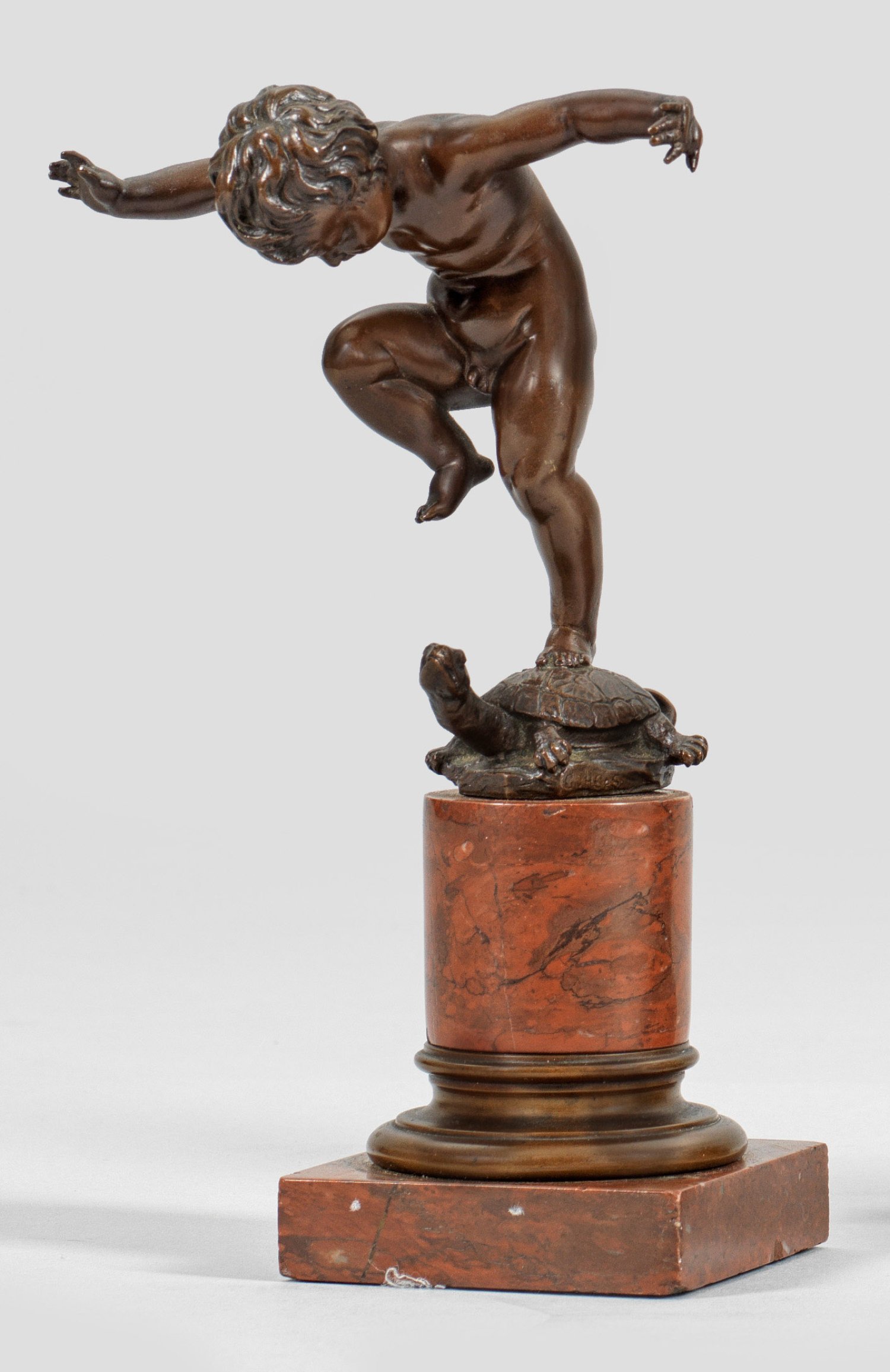 Bronze figurine of a putto balancing on a turtle. Signed. Minor flaws to the dark red marble and bronze base.