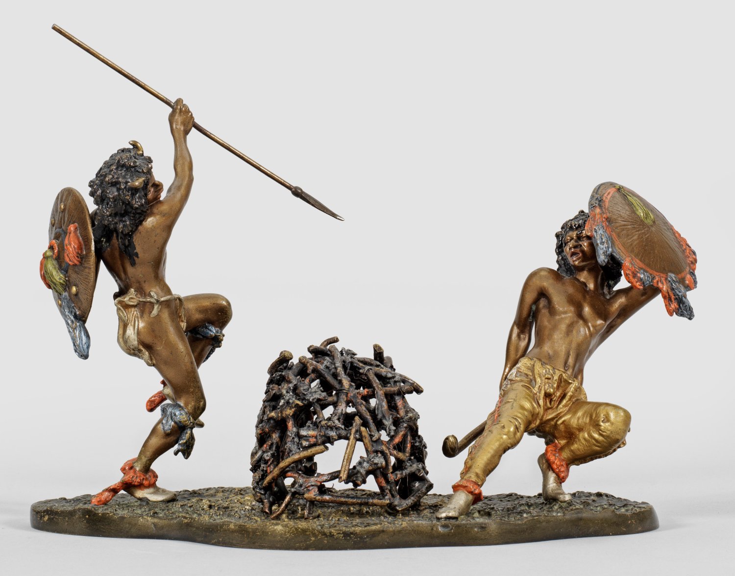 Kalt patiniert und polychrom bemalt. Auf einer länglich ovalen, geschweiften, reliefierten Plinthe zwei vollplastische Indianer mit Tomahawk, Steinkeule und Schilden, die an einem aufgeschichteten Reisighaufen als Lagerfeuer einen ekstatischen Freuden- oder Kriegstanz vollführen. Franz Xaver Bergmann-Firmenmarke (sog. Krugmarke) mit Bez. "GESCHÜTZT" u. undeutl. Modell-Nr.; H. 21,3 cm; B. 29,5 cm.