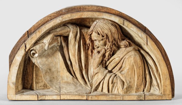 Lindenholz, geschnitzt. Segmentbogenförmige Komposition. Reliefplastische, realistische Darstellung Christi, der über eine von ihm mit der rechten Hand ausgebreitete Schriftrolle sinniert. Spannungsrisse. 23,2 cm x 41 cm x 11,5 cm.