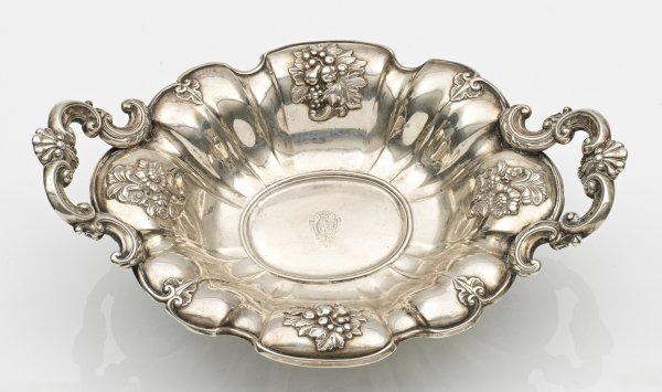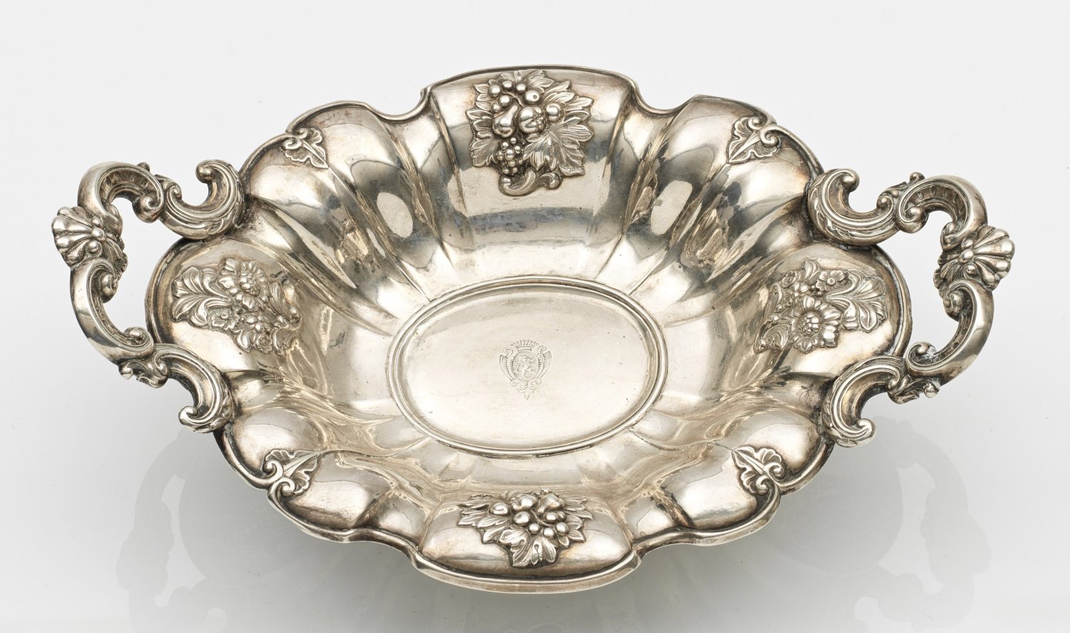 Silber. Ausgestellter Stand, übergehend in gemuldete, von vertikalen Zügen gegliederte Schale mit Handhaben aus reliefplastischen Rocaillen. Auf der Fahne reliefierte Frucht- und Blütenbukets. Im Spiegel graviertes Wappen. Gest. 84, Beschaumeister Dmitrij Ilitsch Twerskoj, Meister Johann Bernhard Hertz (wird Meister 1834). Gew. ca. 345 g. H. 8,5 cm. 28 cm x 19,5 cm.